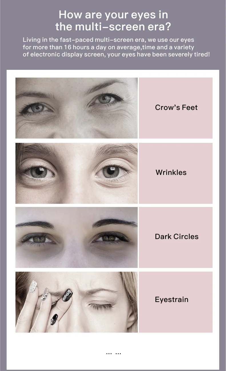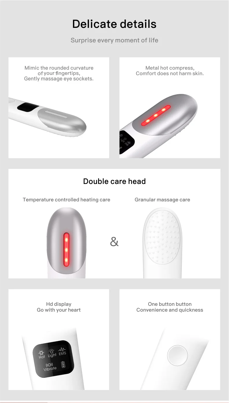 Название: EMS-массажер для глаз Красный ремешок: 620 ± 20 нм Температура нагрева: 42 ℃ ± 2 ℃ Ток EMS: до 30 μa Напряжение тока: 5 В Мощность нагрева: 3 Вт Расход тока: 450mA Емкость аккумулятора: 500 мАч Время работы: более 90 минут Время зарядки: около 2 часов Размер продукта: 160x30x19.5mm