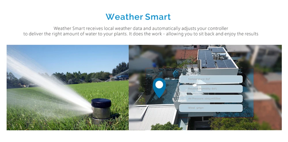 [Работает с прогноза погоды]Weather Smart принимает местные данные о погоде и автоматически настраивает ваш контроллер, чтобы доставить нужное количество воды вашим растениям. Это делает работу, позволяя вам сидеть сложа руки и наслаждаться результатами.