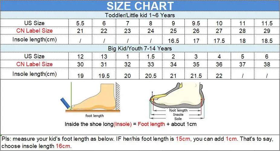Что касается размера,Измерьте длину детской стопы см или дюйм + 1 см или 0,03937 дюйма,Выберите соответствующий американский размер, спасибо!