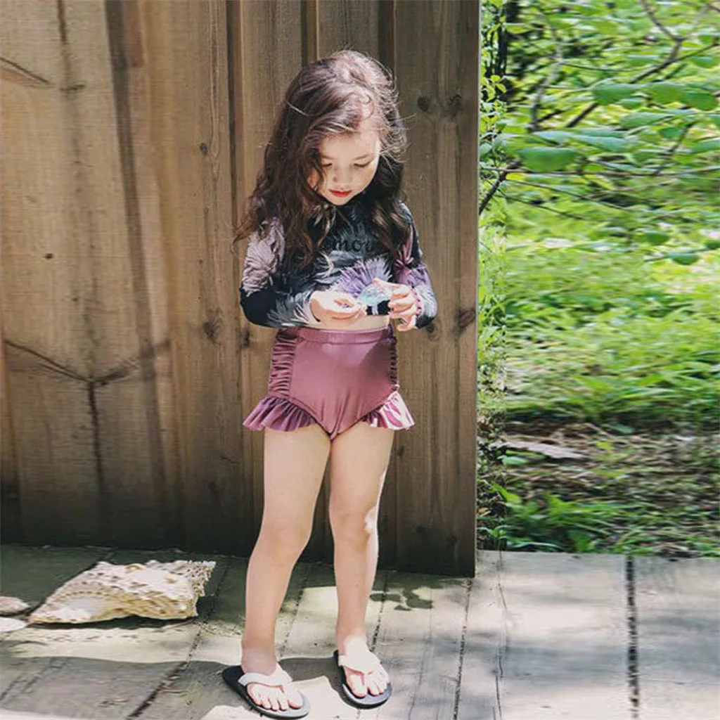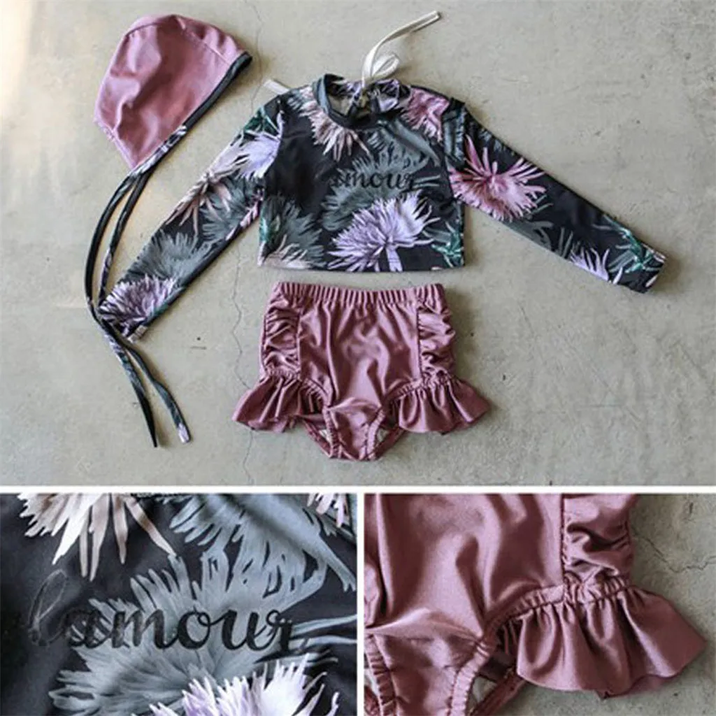 Женский раздельный купальник с оборками и цветочным принтом, купальный костюм с длинным рукавом и плавающей шапкой