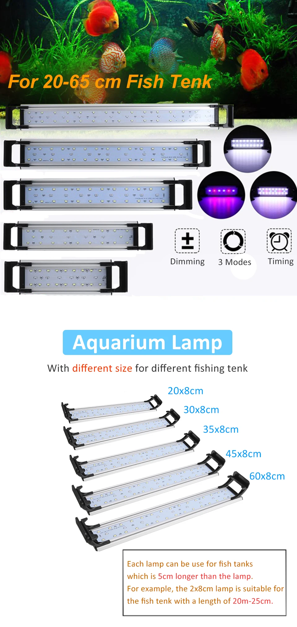 2 -- этот светильник подходит для резервуаров длиной 20-25/30-35/35-40/45-50/60-65 см, пожалуйста, подтвердите длину вашего резервуара перед покупкой.