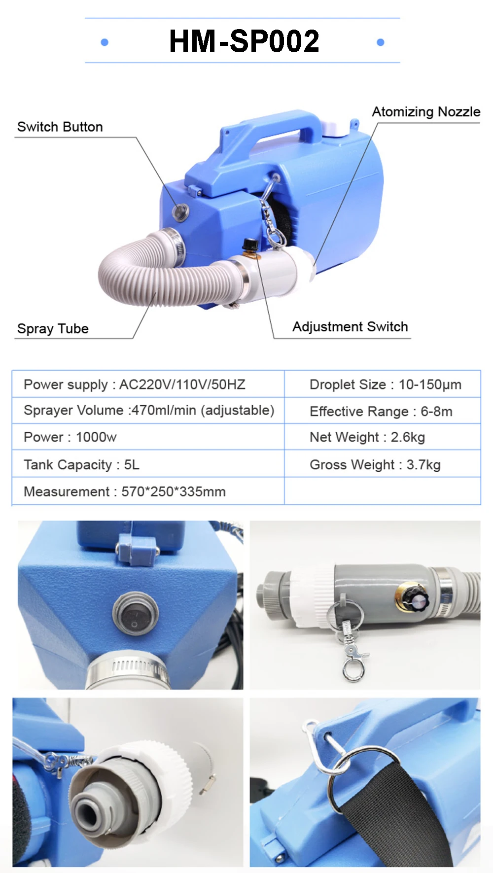 Электрический распылитель Fogger ULV, убийца комаров, сельское хозяйство, офис, промышленность, гостиница Описание товара Модель: Электрический распылитель ULV Напряжение: 220 В переменного тока Мощность: 800 Вт Емкость бака: 5 л Частицы тумана: 0-20 микрон (регулируемые) Расстояние распыления: 6 м-8 м Длина лески: 6 м Максимальная скорость распыления: 470 мл/мин. Размер: 568*250*335 мм Область применения: _ Отель, отели, торговые центры, рестораны и семейная фумигация; Стерилизация _ Больницы, школы, театры и другие общественные места дезинфекции; _ Машины, поезда Меры предосторожности: _ Этот распылитель не разрешается распылять или наполнять воспламеняющиеся, взрывчатые, высококоррозионные вещества, такие как спирт, бензин, бензол и дезинфицирующее средство высокой концентрации (дезинфицирующее средство необходимо разбавить перед использованием). _ Пожалуйста, не используйте распылитель в плотно закрытом помещении. Двери и окна можно закрыть после распыления, чтобы усилить эффект нанесения и защитить здоровье человека. _ Запрещено чистить распылитель водой Tianna или бензином. При очистке внешней части машины водой или другими нейтральными моющими средствами следует соблюдать осторожность, чтобы не класть воду или нейтральные моющие средства в корпус двигателя. _ После каждого использования необходимо вылить неиспользованную жидкость, обратите внимание, чтобы не загрязнить окружающую среду. Кроме того, аптечка наполнена водой, и распыление запускается примерно на 0,5-1 минуту, чтобы очистить трубки машины, чтобы избежать коррозии жидкости. И продлить срок службы машины. Это очень важно и необходимо. _ Запрещено хранить в условиях высокой температуры или на солнце в течение длительного времени, чтобы не обжарить, не деформироваться, не выцветать или не треснуть. _ Запрещено тянуть шнур питания, чтобы снять вилку и отключить питание. Используйте резиновое положение вилки, чтобы потянуть вилку вручную. Посылка 1 х Электрический распылитель ULV