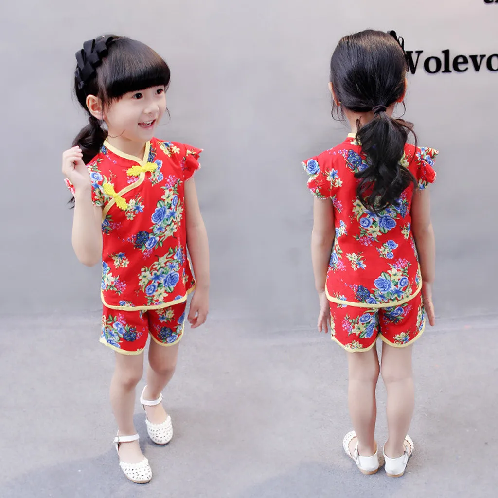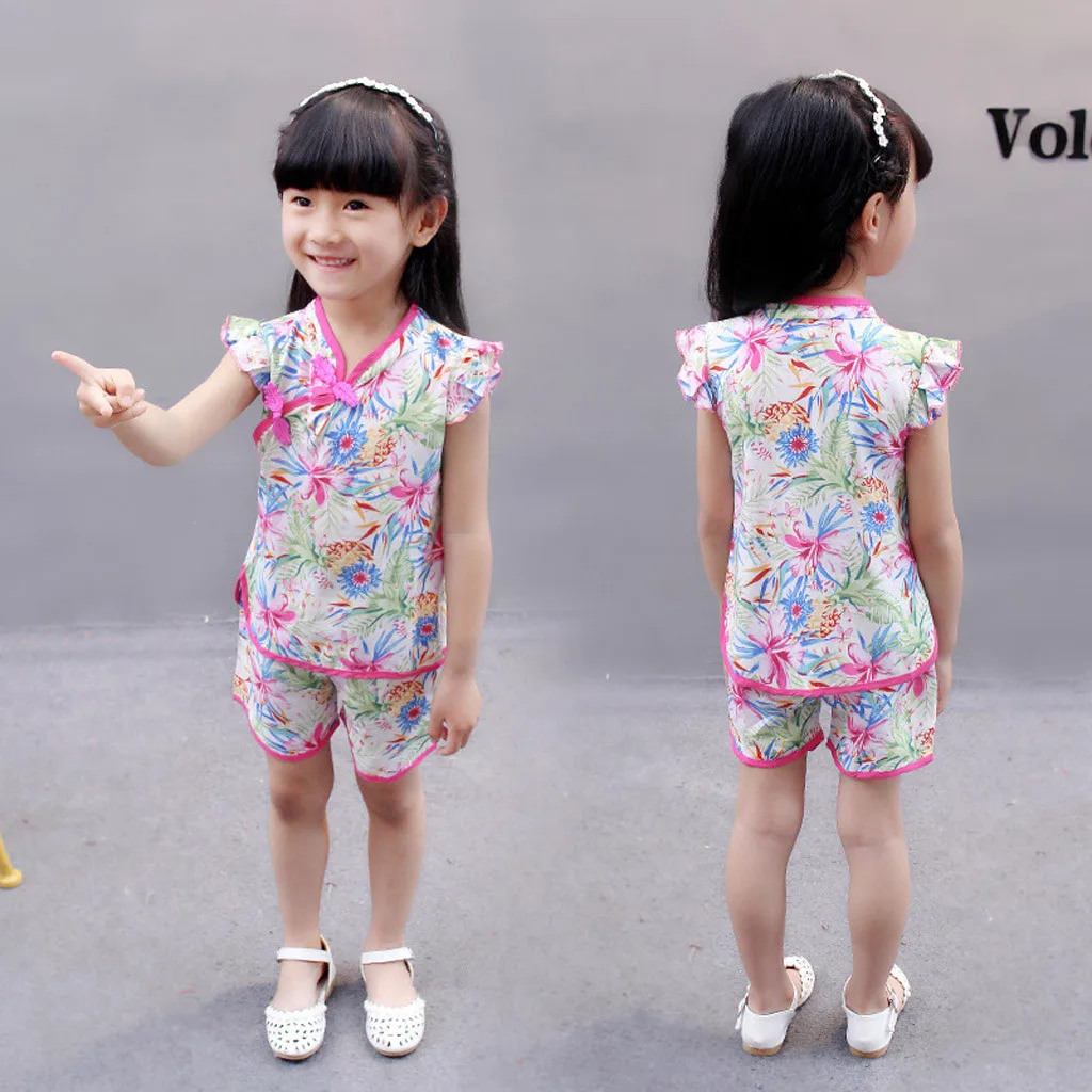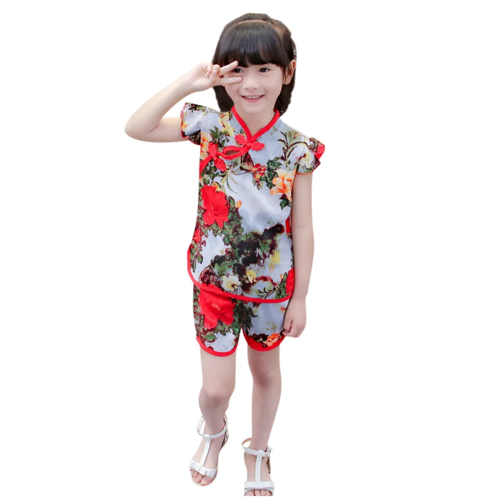 Топы с цветочным принтом для маленьких девочек; Футболка; Шорты; Одежда чонсам