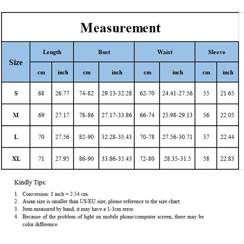 Особенности: 1 см = 0,393 дюйма, 1 дюйм = 2,54 см Размер Длина Бюст Рукав Талия | ||||||