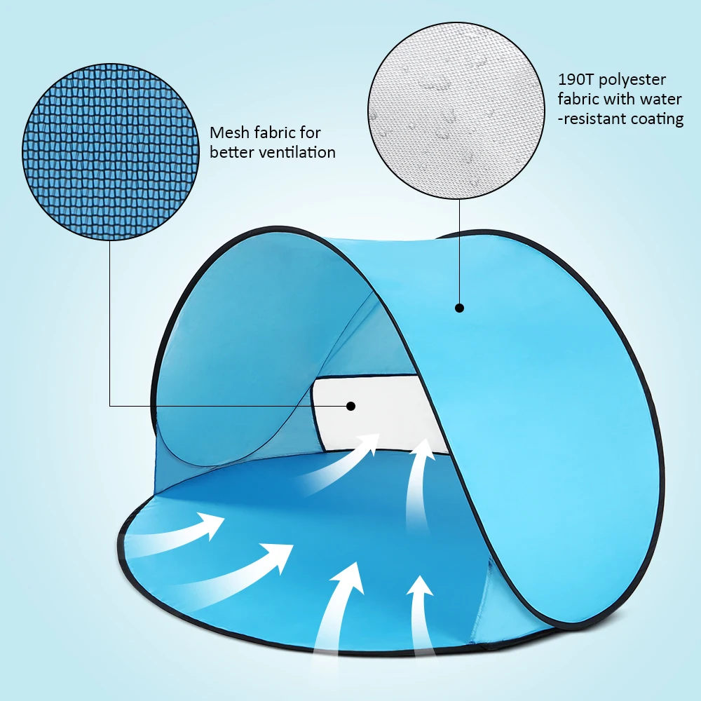 Этот Пляжный Тент водостойкий, легкий и дышащий. Он может предложить отличное укрытие для ваших детей. Легко открывается без сборки и складывается за считанные секунды, очень удобно для кемпинга, пеших прогулок, рыбалки и других видов активного отдыха.