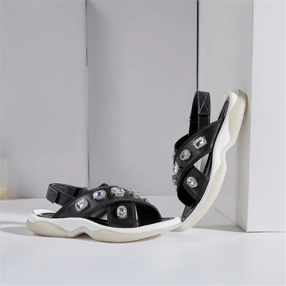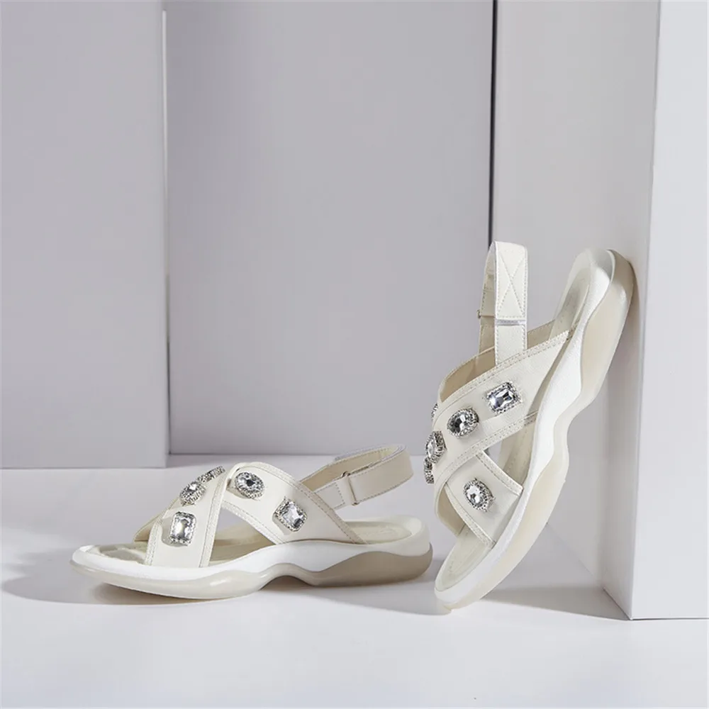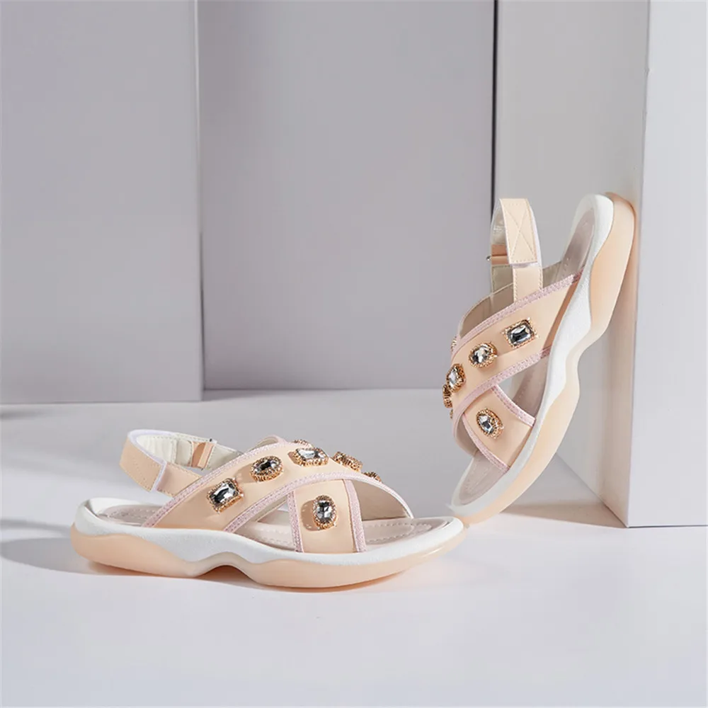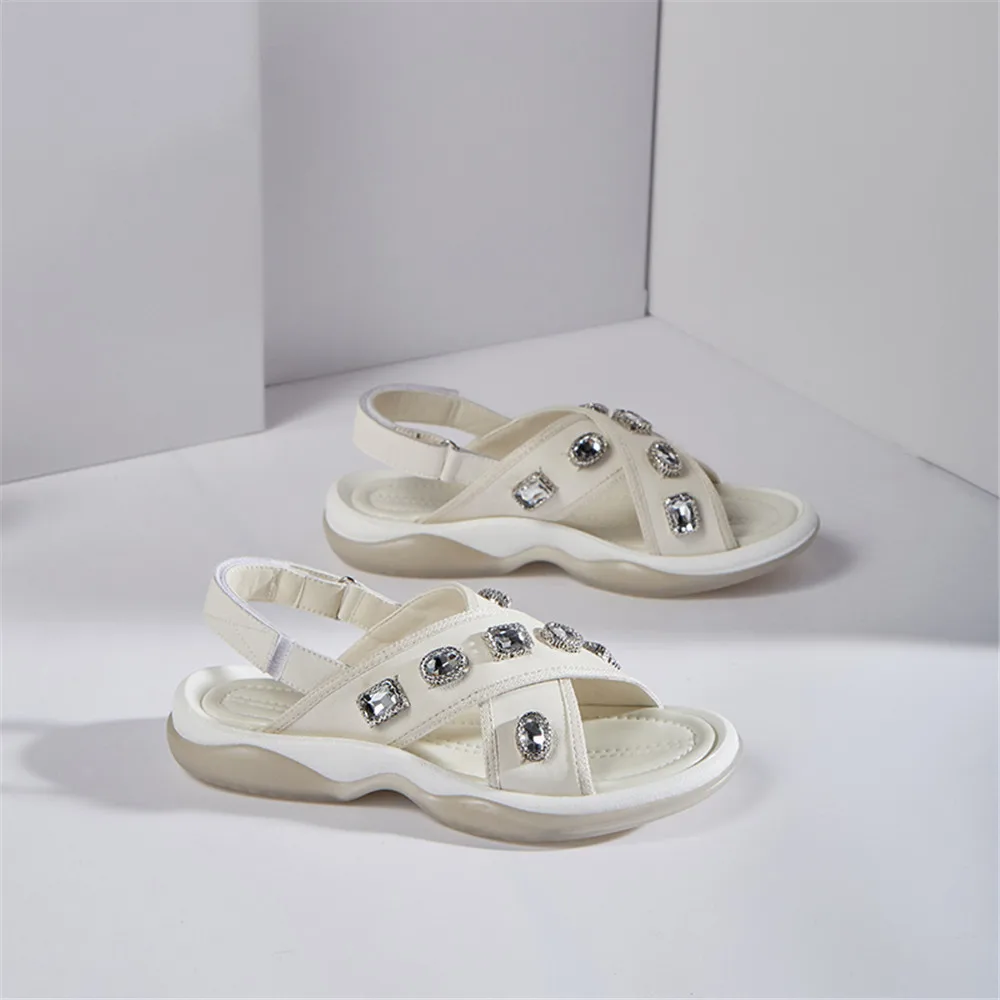 MILI-MIYA, Модные женские сандалии Повседневная летняя однотонная обувь из коровьей кожи на плоской подошве, с круглым носком, на застежке-липучке, со стразами Размеры 35-42