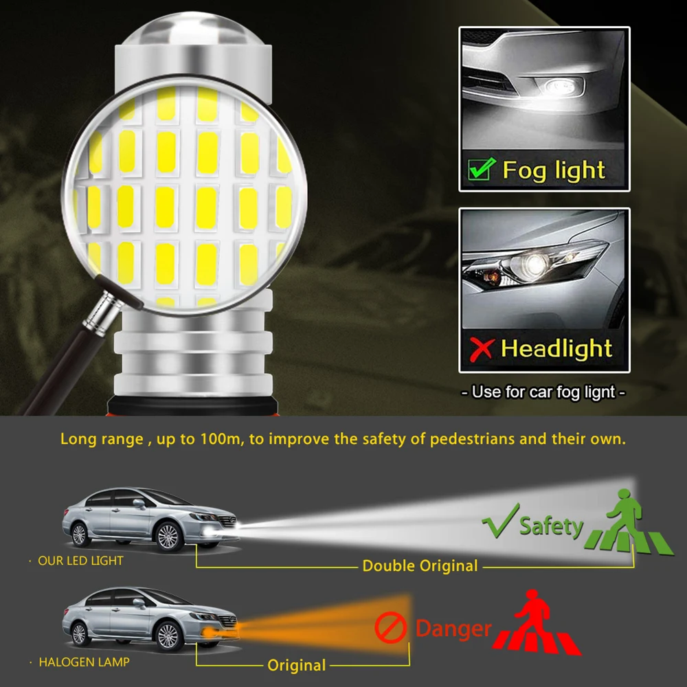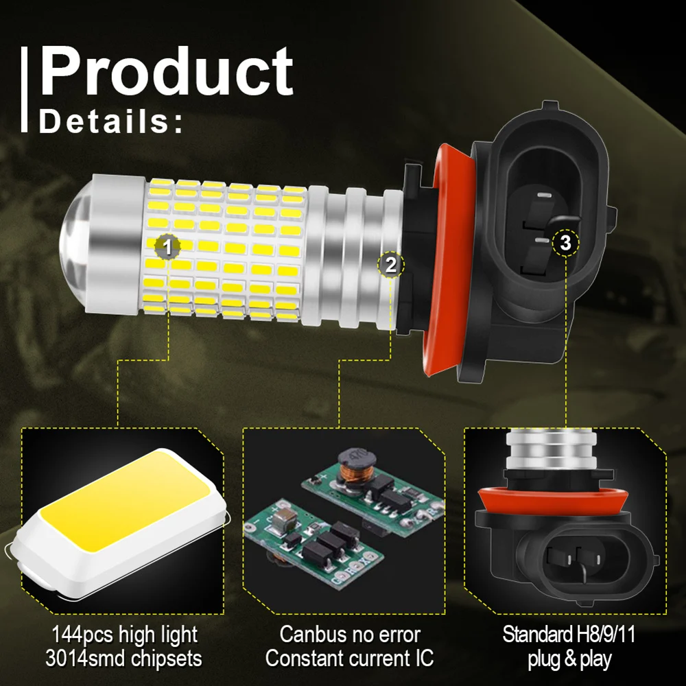 -Светодиодный Тип: 144 шт. 3014 высокомощных EX чипсетов на лампу с проектором. -Цвет: ксеноновый белый -Выход освещения: около 1500 люменов для каждой лампы, всего 3000 люменов -Размер: 1,80 "и 0,8" в диаметре (светодиодный часть) -Рабочая Напряжение: 12V-24V -Перекрестные ссылки: H10, H11/H8, H16, PSX24W, 9005/HB3, 9006/HB4 -Материал корпуса: алюминиевый сплав -Простая установка, просто подключи и работай, угол обзора 360 градусов -Быстрое включение/выключение времени отклика и устойчивость к вибрации. -Экологичность: энергосбережение, отсутствие УФ-и ИК-излучения, ударопрочность и защита от коррозии -Применение: Противотуманный светильник, DRL (дневной ходовой светильник) -Установка: просто подключи и работай