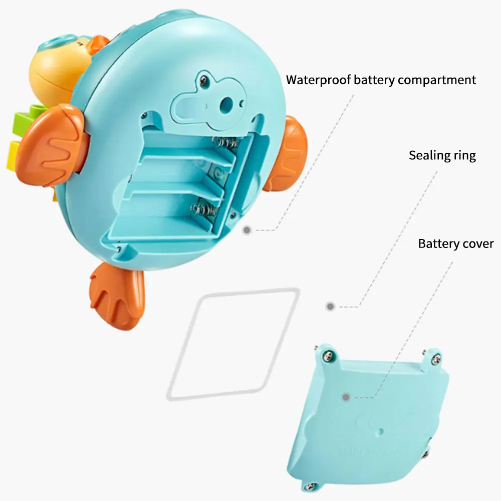 -Игрушка имеет водонепроницаемую структуру для батареи, со встроенным уплотнительным кольцом, игрушка изолирует батареи и все цепи от внешнего мира. Комплексный водонепроницаемый дизайн позволяет ребенку использовать игрушку для развлечения.