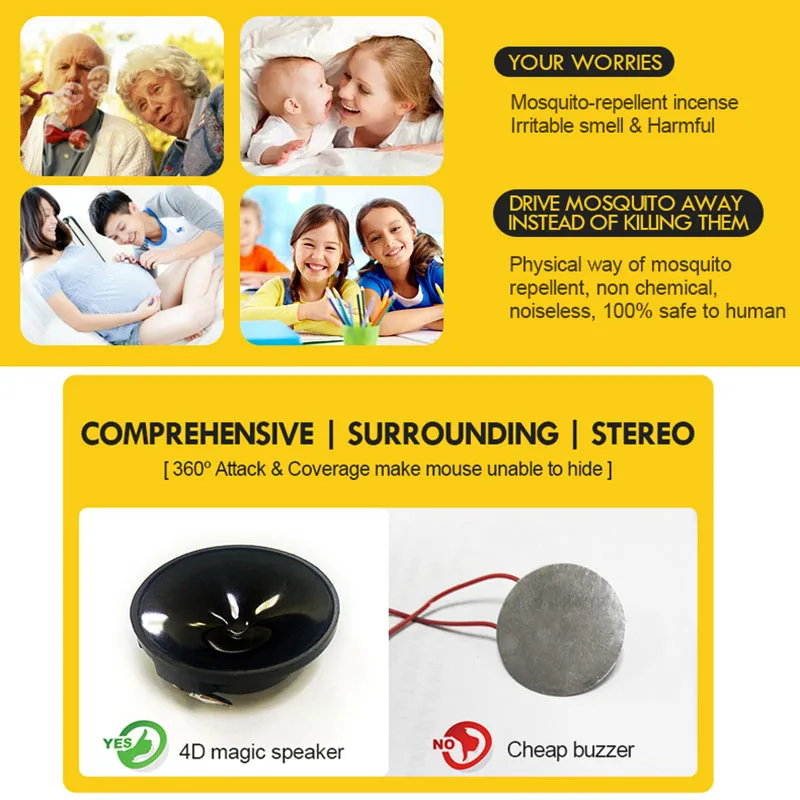 Люди и домашние животные, такие как кошки или собаки, не будут слышать никакого звука.Кроме того, он не производит никакого вредного излучения и поэтому безопасен для беременных женщин и семей, используемых детьми.