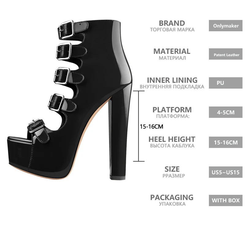 Материал-лакированная кожа Цвет: красный/черный/зеленый/белый Модный дизайн; Босоножки на платформе с ремешками с пряжкой-это самый модный и популярный летний стиль; Очень высокий каблук подарит вам больше уверенности во время прогулки, будь настоящим человеком и поп-звездой! Высота каблука-прибл. 15-16 см/5,9-6,1 дюймов; Платформа прибл. 4-5 см/1,58-1,97 дюймов. Устойчивая обувь на высоком массивном каблуке; Прочная и удобная обувь Лучшие подарки-сексуальные сандалии на платформе с массивным каблуком-Самые желанные и подарочные идеи для жены, дочери, девушки, любимой. Большой размер для широкой стопы доступен. Повод-отлично подходит для вечеринок, клубов, модельного шоу. Будьте свободны, чтобы сочетать их с вашей сексуальной одеждой, смело меняйте свой наряд! Размер: US5-US15 Бренд: Onlymaker (зарегистрированный товарный знак) Все права защищены Верный размер-Пожалуйста, обратите внимание на таблицу размеров (рисунок) и описание Примечание. На разных мониторах цвет товара может отображаться немного по-разному. Надеюсь, вы понимаете! Если вы не удовлетворены товаром, пожалуйста, сначала свяжитесь со мной, мы предоставим вам удовлетворительное решение.![]()