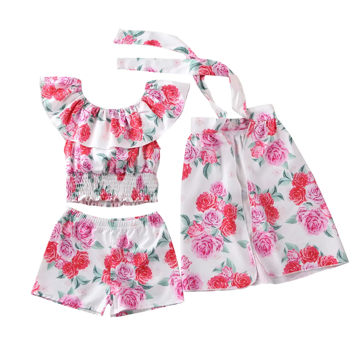 Одежда для маленьких девочек; Топы с цветочным принтом и рюшами; Штаны; Плащ; Комплект одежды