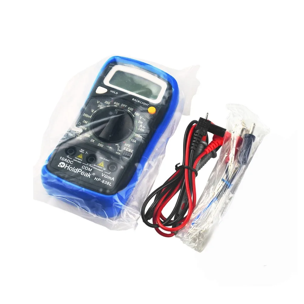 【Поддержка удержания данных и подсветки 】поддержка удержания данных удобна для записи и отзыва. Нажмите кнопку подсветки и вы можете увидеть ночью. 【Защита от перегрузки и испытание на непрерывность использования схемы защиты PTC для измерения сопротивления, температуры и частоты. Если измеренное сопротивление менее 100 Ом, звуковой сигнал будет звучать. 【 Ручное и автоматическое отключение питания 】 1999 отсчетов ручной мультиметр точно измеряет напряжение переменного/постоянного тока, постоянный ток, сопротивление, диод, hFE. 【Индикация низкого заряда батареи и ЖК-дисплей с подсветкой 】 3 1/2 цифр ЖК-дисплей для видимости в тускло освещенных областях. Есть индикатор низкого заряда батареи, так что вы никогда не случайно не иссякнут сок. 【Что вы получите? 】 1x HoldPeak HP-838L Цифровой мультиметр мульти тест er, 1x Руководство пользователя, 1x тест-свинец.