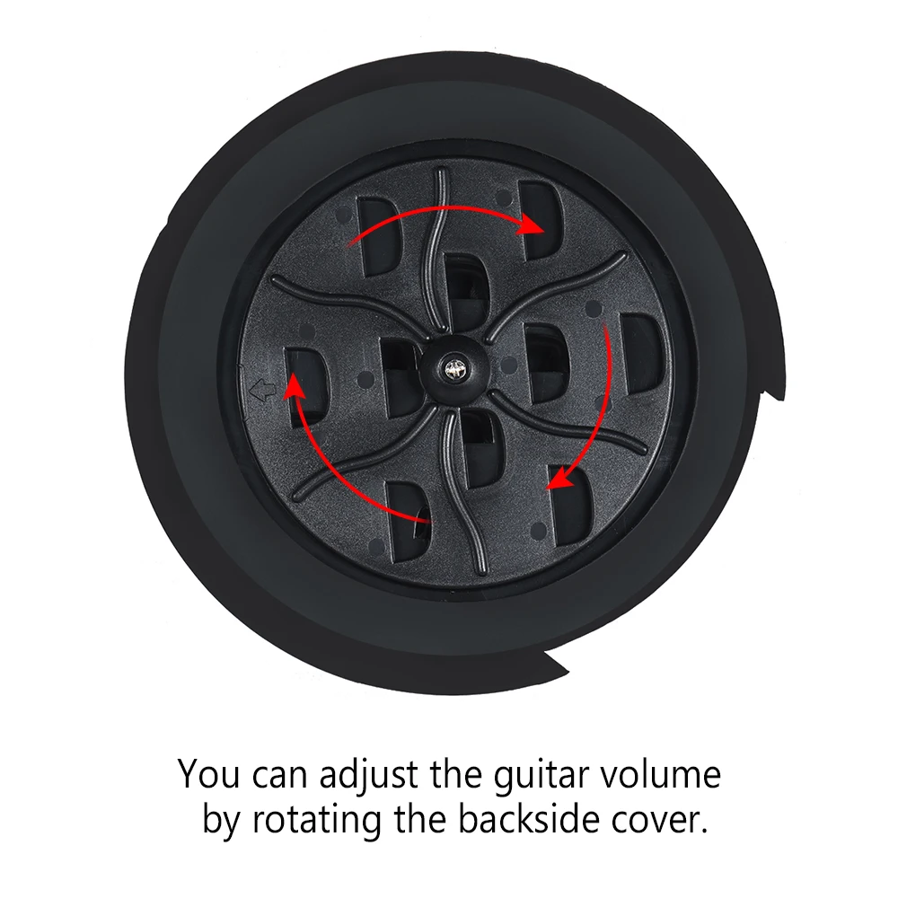 Крышка звукового отверстия предназначена для эквалайзерных народных гитар (диаметр звукового отверстия 10 см). Для устранения нежелательных отзывы в усиленной производительности. Также для регулировки громкости гитары, вращая заднюю крышку. Быстро и легко установить и удалить, полезно для защиты звукового отверстия. Мягкая резина закрывает края вставки, не повреждает вашу гитару