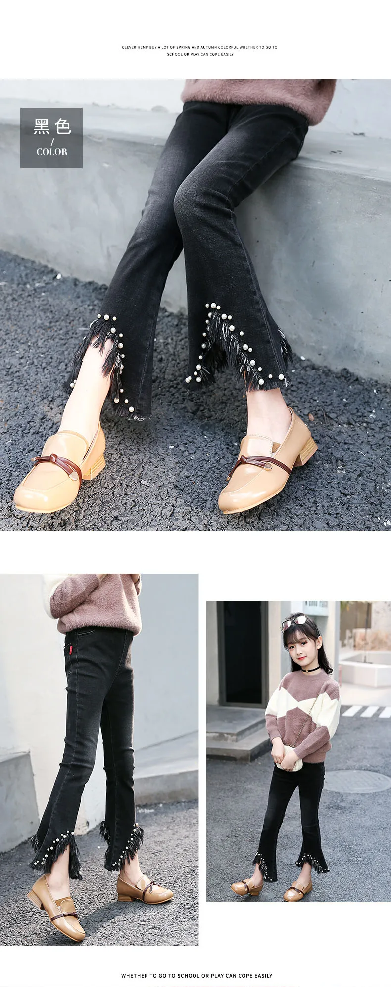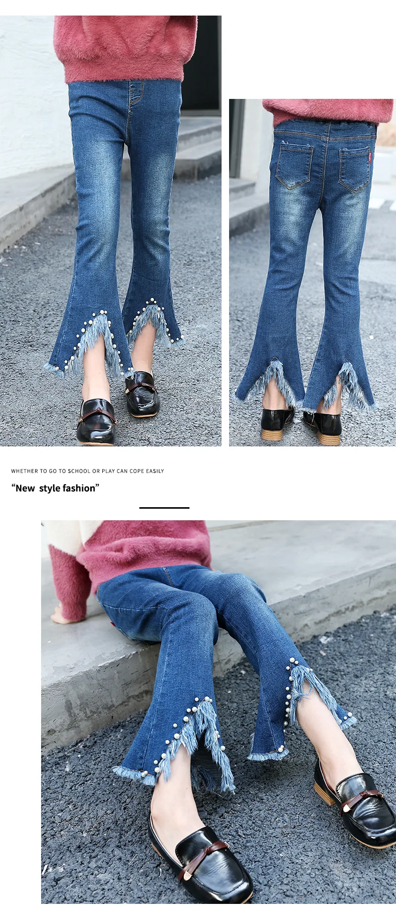 Расклешенные джинсы с жемчужинами и кисточками для девочек; Весенняя одежда; Детские джинсы; Эластичные джинсовые штаны; Модные джинсовые брюки; От 5 до 12 лет детские джинсы