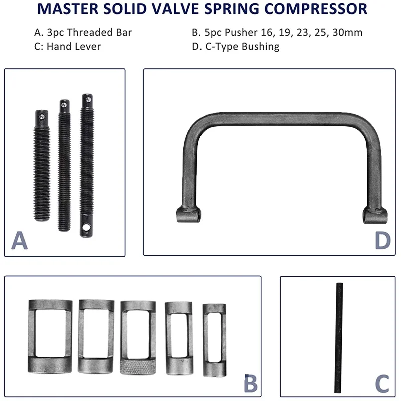 1. Профессиональный инструмент для компрессора пружин клапанов позволяет снимать и сжимать пружины клапанов на большинстве головок цилиндров более удобно.