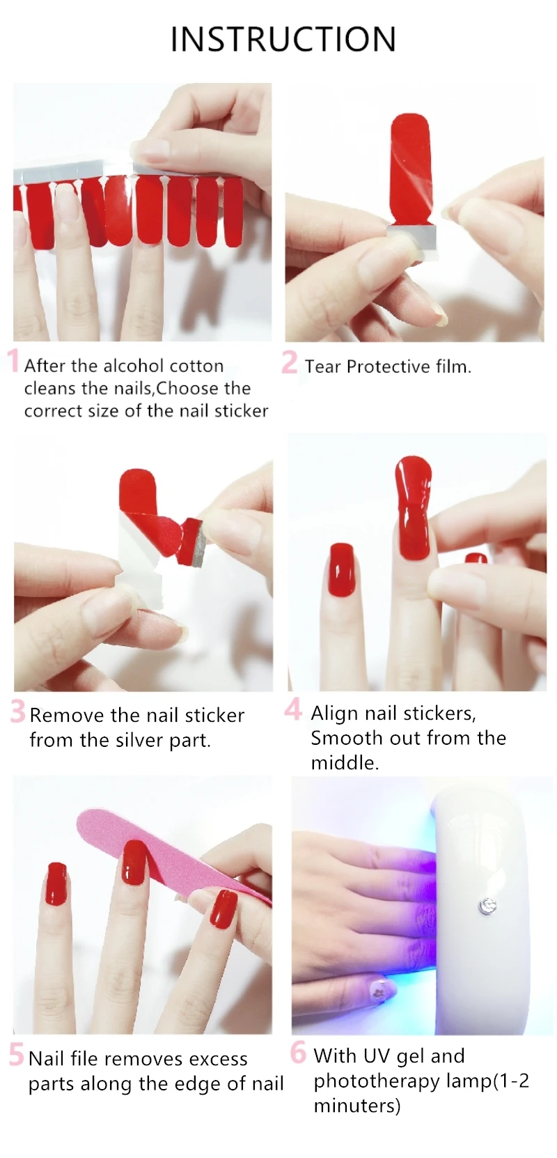 1. File nails and push back cuticles in advance for better results. *DO NOT TOUCH THE SURFACE OF NAILS ANYMORE AFTER CLEAN IT! 2. Select a suitable size (cut to the correct size if necessary), peel off the clear film and stick the nail polish stickers on white paper crossed. *Notice: DO NOT TOUCH THE BACK SIDE OF NAIL POLISH STICKERS TO AVOID THE OIL OF SKIN. 3. Place the round edge on nail base, and press gently. *Notice: DO NOT APPLY ON CUTICLE AND SKINS. 4. Rip down the excess part gently, and file the edge of nails 5. Press the nail surface repeatedly in order to force out the air, apply the nail polish stickers tightly. 6. Apply top coat for best result, and cure with lamp.(Non-essential)
