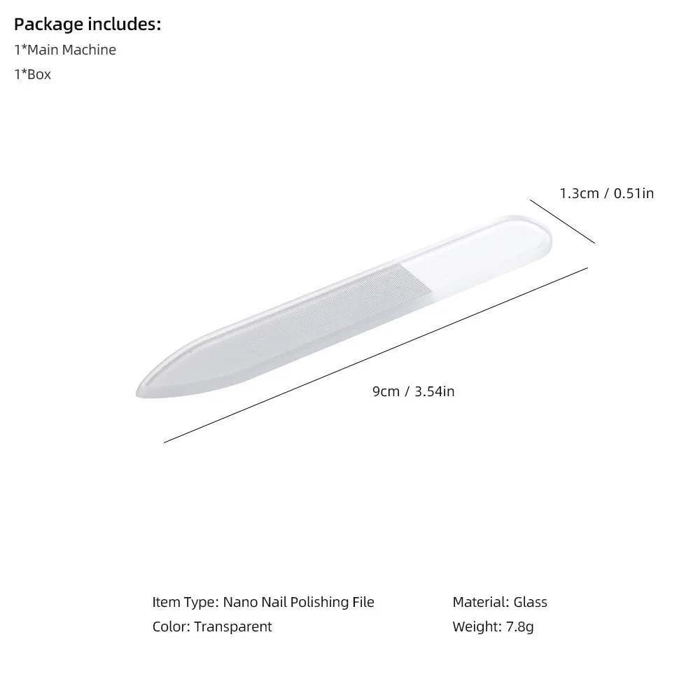 Тип изделия: пилочка для ногтей Цвет: Прозрачный Материал: Стекло Вес: 20g Размеры: Стекло: 9*1,5 см/3,54 * 0.59in