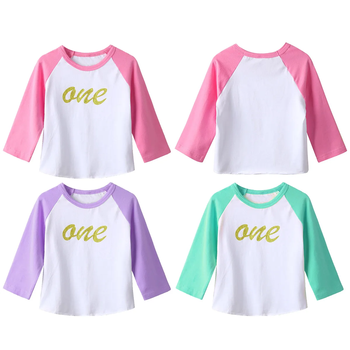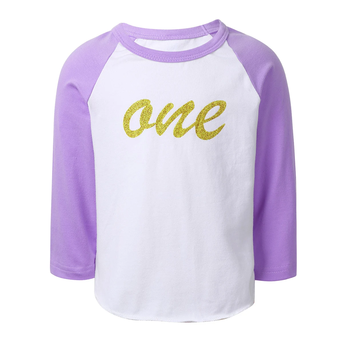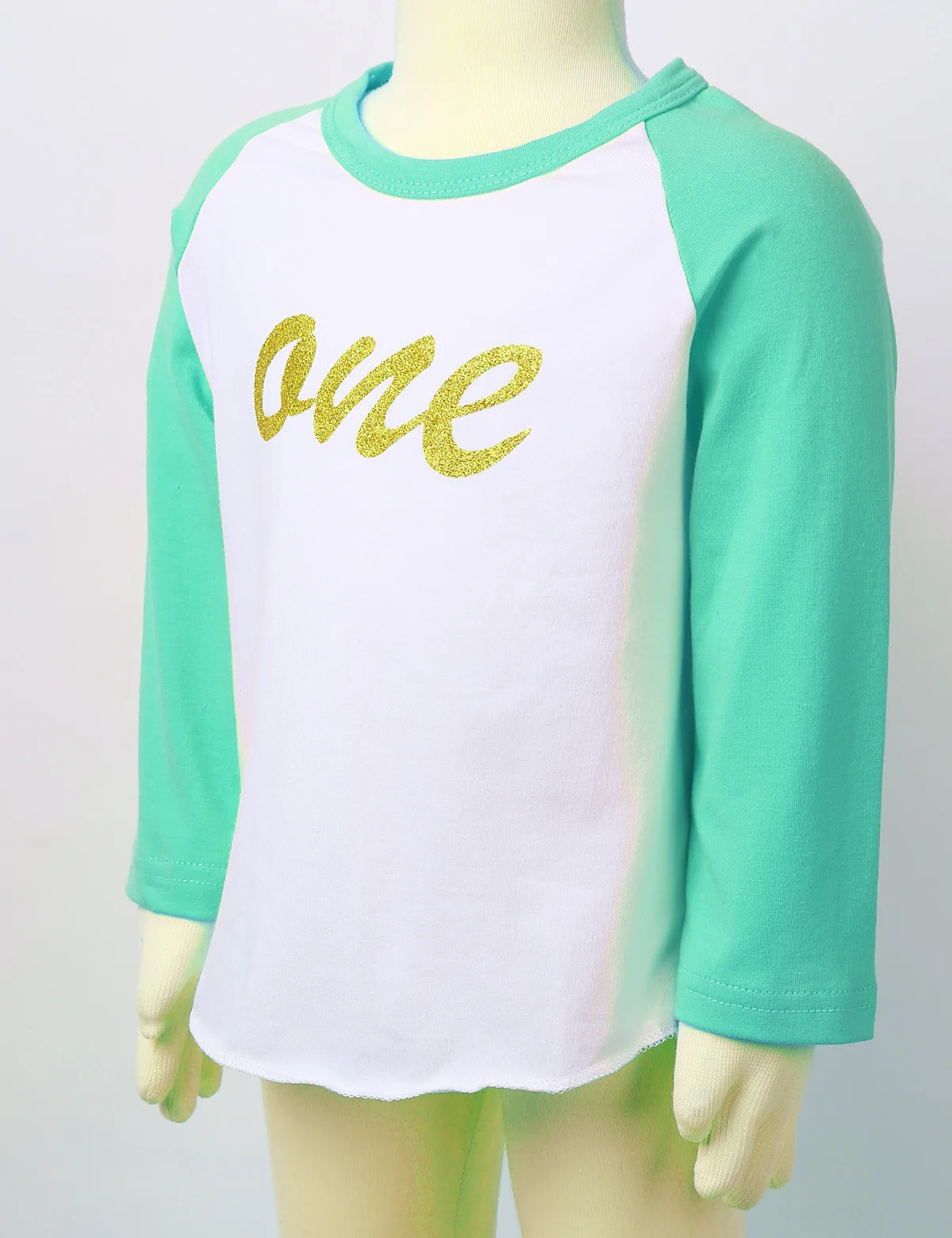 Рукава реглан 3/4, круглый вырез. Принт спереди с блестящими буквами «one», очень сверкающий.