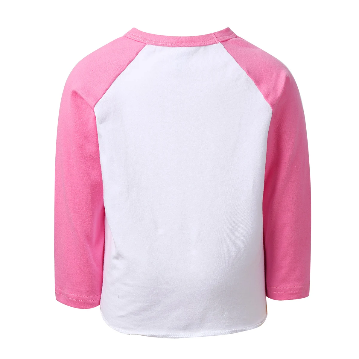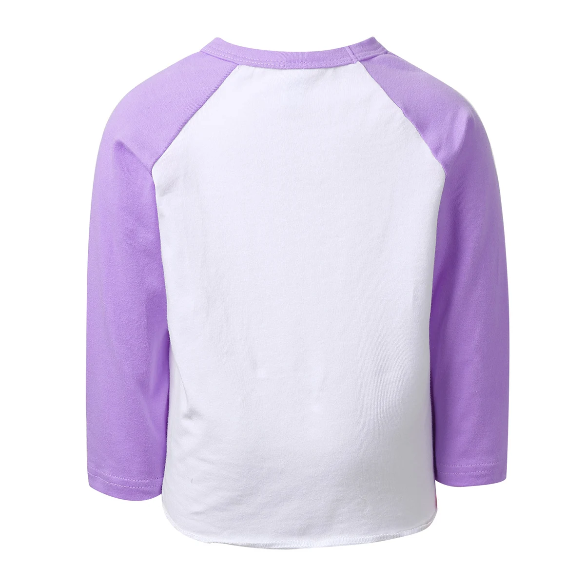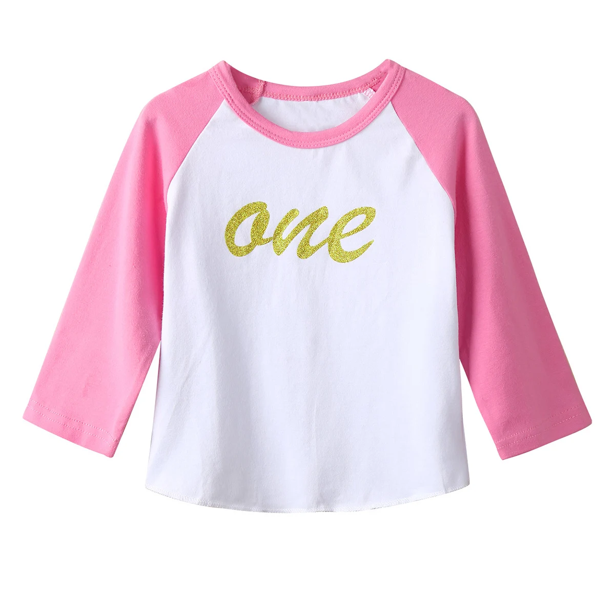 Рукава реглан 3/4, круглый вырез. Принт спереди с блестящими буквами «one», очень сверкающий.
