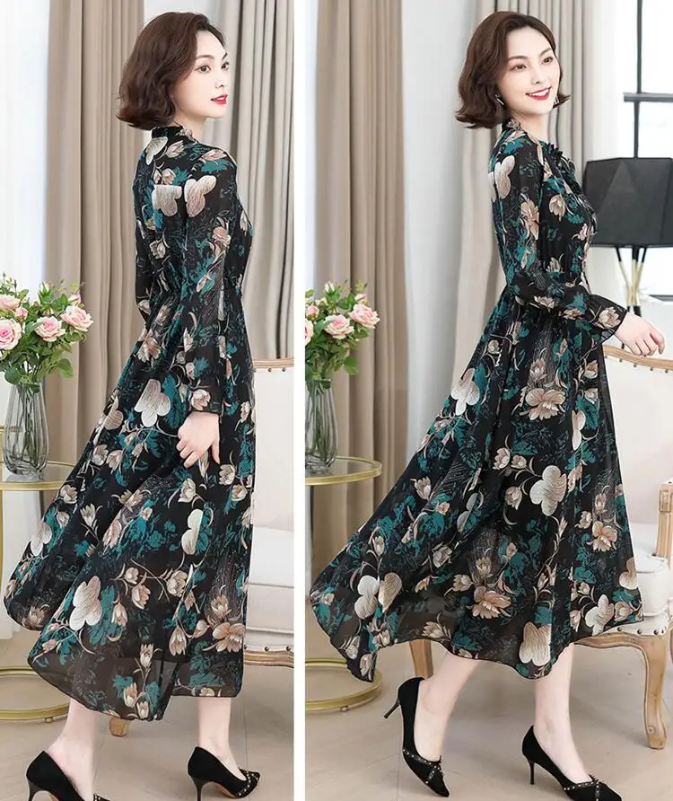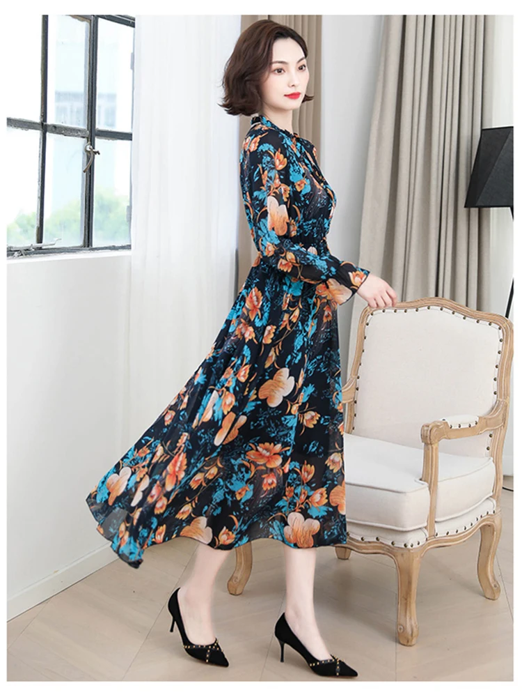 Летнее дамское шифоновое платье осеннее модное элегантное платье с длинными рукавами и принтом темпераментное ТРАПЕЦИЕВИДНОЕ ПЛАТЬЕ в стиле ретро с роговыми рукавами h0023