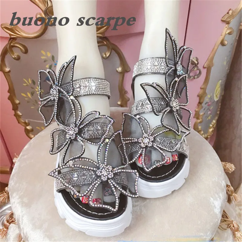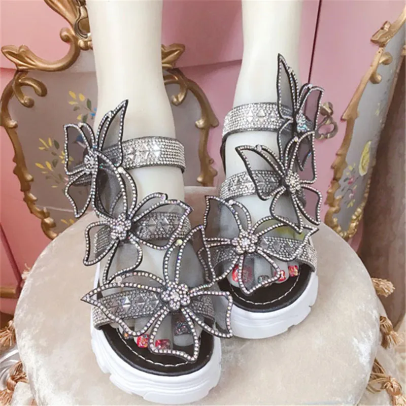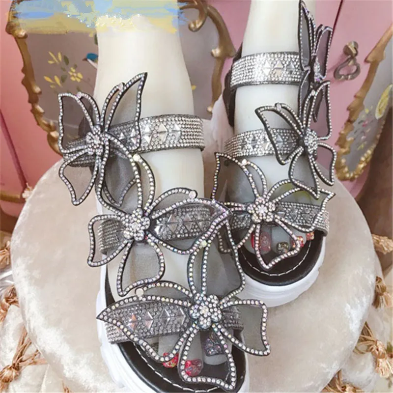 Premium handmade custom diamond-encrusted black butterfly platform sandals with a word band dream fairy princess sandal