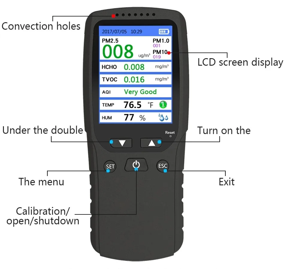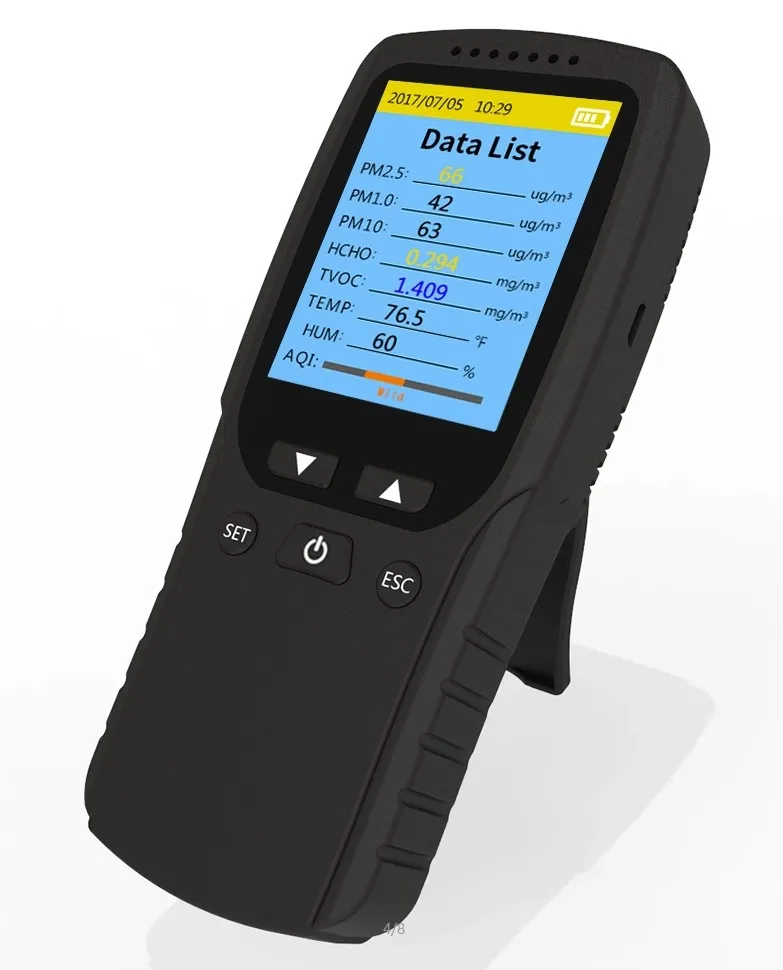 Во многих городах они загрязняют воздух, поэтому необходимо проверить качество воздуха. Идеальный многофункциональный инструмент для тестирования для контроля качества воздуха, защита для здоровья семьи, если вы беспокоитесь о качестве воздуха вокруг вас или ваших детей. При превышении стандарта, быстрая сигнализация! Также нам нужно определить качество воздуха во внутренней комнате, особенно новый дом для украшения, не забывайте, что формальдегид HCHO/TVOC-это здоровый убийца, особенно для детей и маленьких детей. Когда мы обнаруживаем нездоровое качество воздуха (особенно полностью закрытое помещение, например, прохладное Кондиционирующее помещение или тепловое помещение. Воздух должен быть очень нездоровым), мы должны открыть дверь или окна, или использовать очиститель воздуха для очистки воздуха, чтобы убедиться, что у нас хорошая здоровая Воздушная среда.