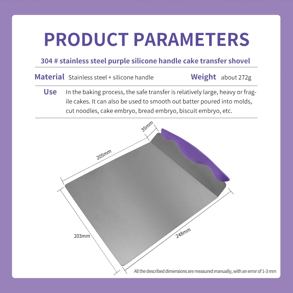 100% Новый бренд Название продукта: лопата для перекачки тортов Материал лезвия: нержавеющая сталь Материал ручки: силикон Размер: 20,5*20,3*3,5 см Вес: 272 г Посылка: 1 шт.