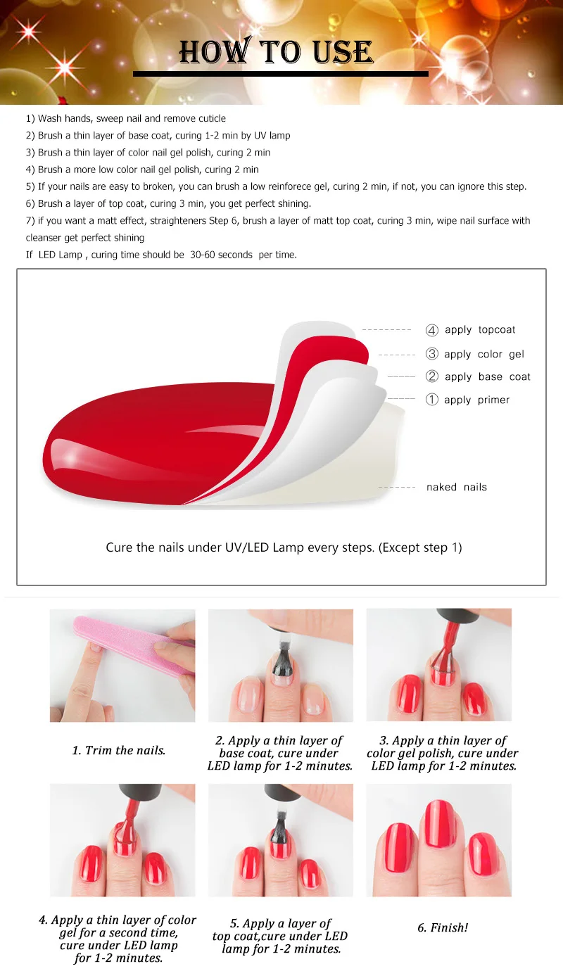 1.-форма поверхности ногтей, очистить кутикулы, для полировки ногтей поверхности и очистить пыль. 2.-нанесите Базовое покрытие слигос (не забудьте запечатать край ногтя). Вылечите светодиодный светильник в течение 60 секунд или УФ-лампа в течение 2 минут. 3.-нанесите первый слой цветного пальто слигос. Вылечите светодиодный светильник в течение 60 секунд или УФ-лампа в течение 2 минут. 4. Нанесите больше слоя цветного пальто, если цвет недостаточно яркий. 5.-нанесите на пальто слигос. Вылечите светодиодный светильник в течение 60 секунд или УФ-лампа в течение 2 минут. 6.-протрите липкий остаток на ногтях очищающим средством.