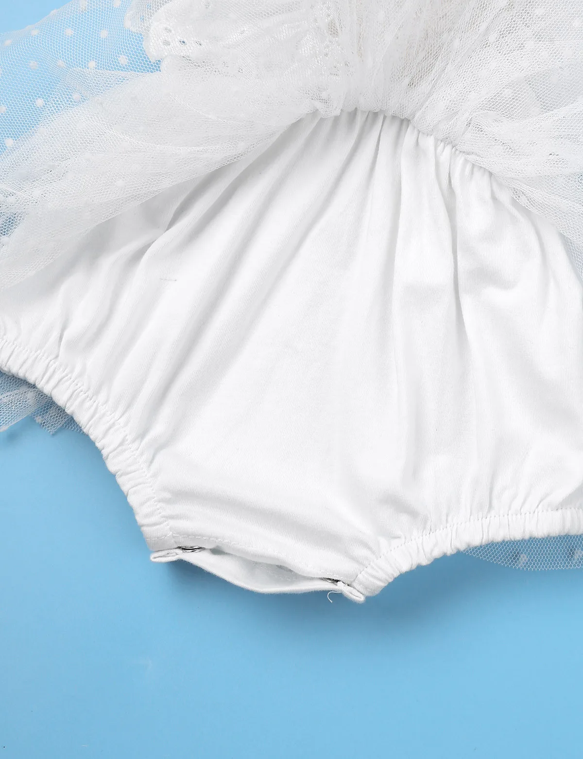 Многослойная юбка-пачка из сетчатого материала, прилегающая к талии. Застежка на кнопки Поппер внизу для легкой смены подгузников. Восхитительное платье-комбинезон для вашей маленькой девочки.
