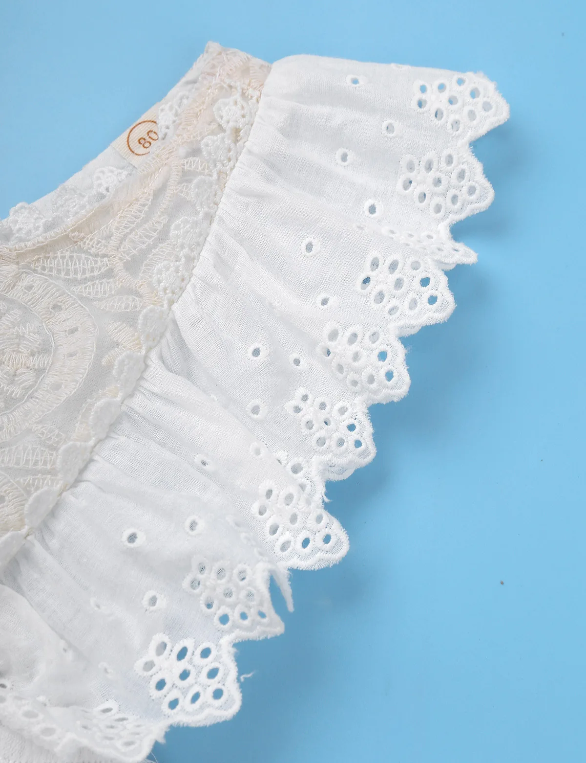 Рукава с оборками, круглый вырез, кружевной лиф с вышивкой, с подкладкой. V-образная задняя часть. Эластичный пояс и отверстие для ног.