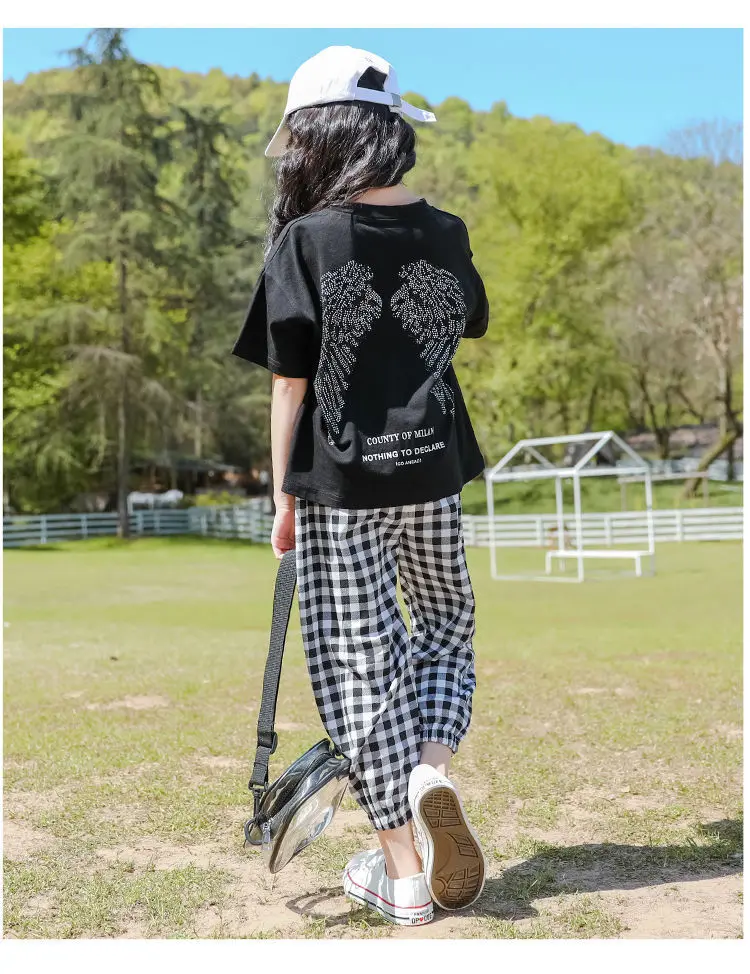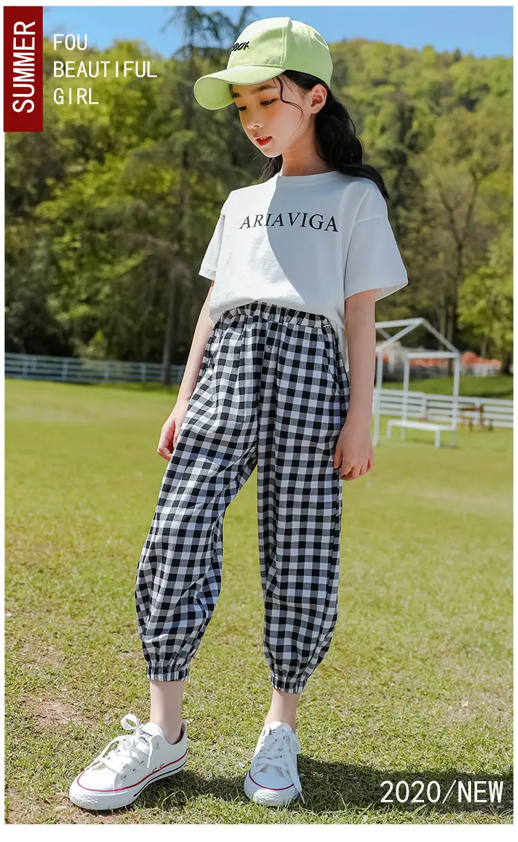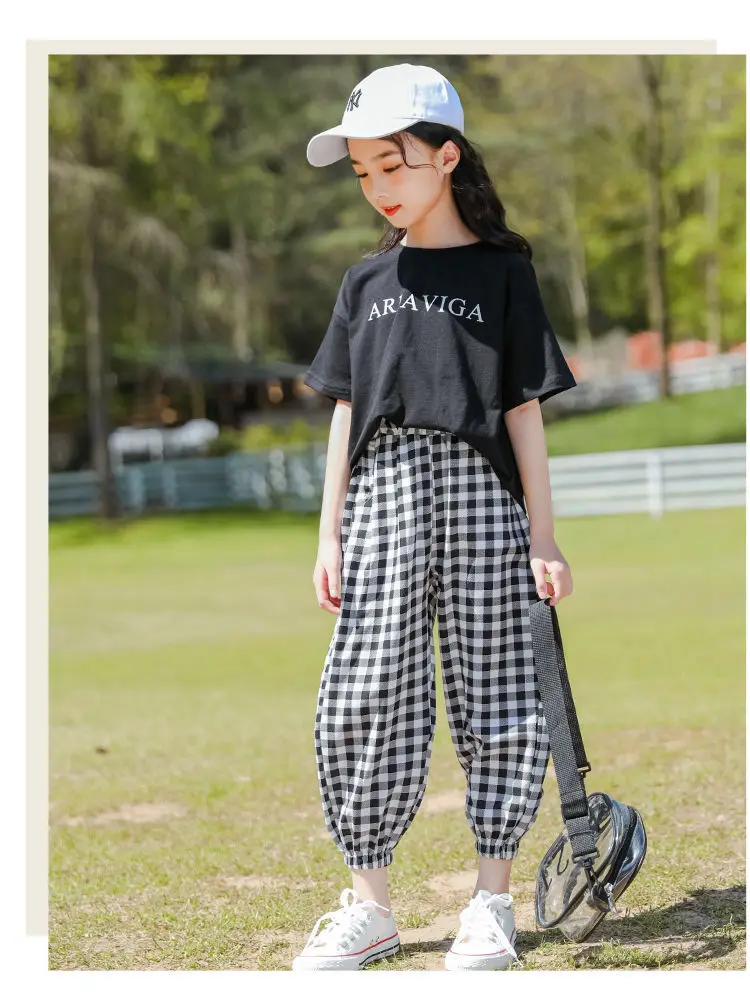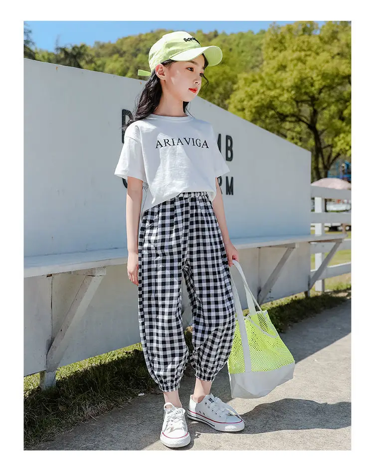 Летняя детская одежда для девочек, футболка + штаны в клетку, повседневный спортивный костюм для детей, комплект из двух предметов для 7, 8, 10, 12, 13 лет
