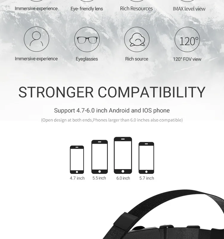 Размер: 268*224*117 мм Аудио: стереофонические Hi-Fi наушники FOV: Макс 120 ° Фокус: близорукость: 0-600 ° Дальнозоркость: 0-200 ° Расстояние между пятнами: 60-72 мм Совместимый телефон: 4,7-6,0 дюйм (ов)