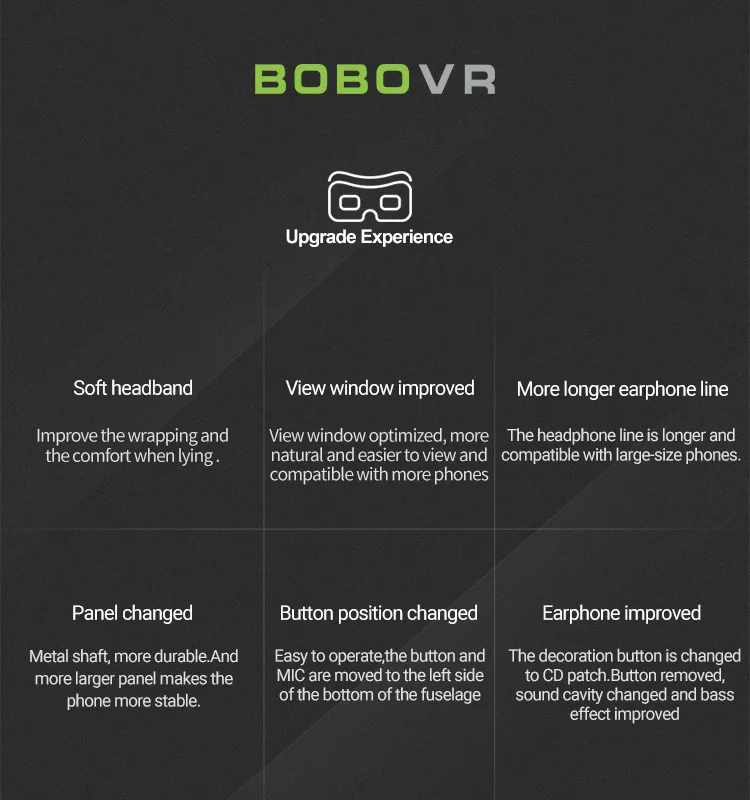 1. Мягкий головной убор улучшает обертку и комфорт при носке; 2. Звуковая полость оптимизирована для усиления эффекта средних басов, а звуковое поле шире; 3. На корпусе объектива оптимизирована для того, чтобы предотвратить светильник загрязнения окружающей среды, вызванных отраженным экран светильник. Изображение более четкое.