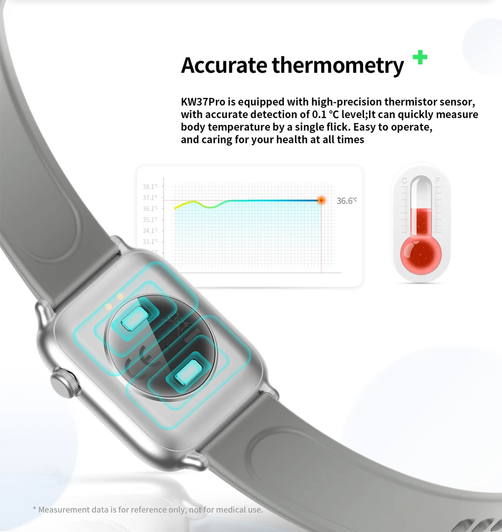 KW37pro оснащен высокоточной themistor датчик, Точное обнаружение 0,1 c уровня; Он может быстро измерить температуру тела одним щелчком. Простота в эксплуатации и забота о вашем здоровье в любое время.