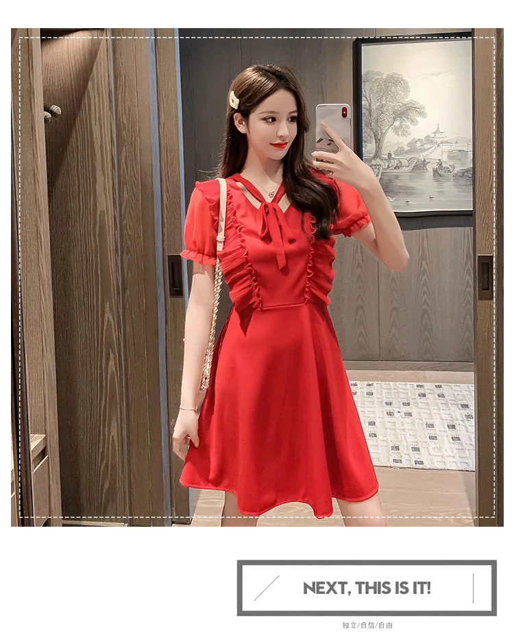 Красное рождественское платье с оборками, женское сексуальное облегающее ТРАПЕЦИЕВИДНОЕ вечернее платье с v-образным вырезом, Летнее мини-платье с галстуком-бабочкой, однотонное платье E0273