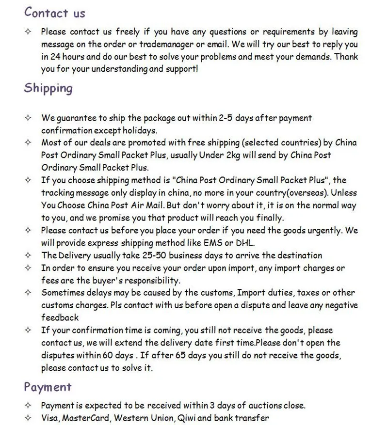 Если ваше время подтверждения приближается, вы все еще не получили товар, пожалуйста, свяжитесь с нами, мы продлим дату доставки в первый раз. Пожалуйста, не открывайте споры в течение 60 дней. Если после 65 дней вы все еще не получили товар, пожалуйста, свяжитесь с нами, чтобы решить эту проблему.