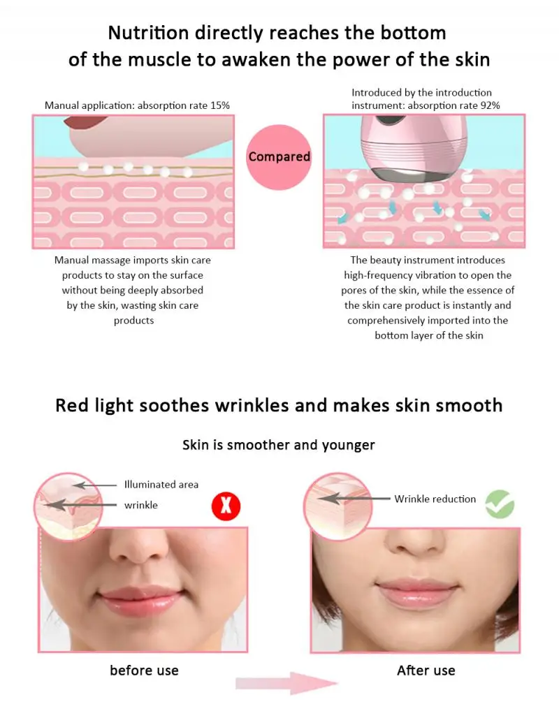 Более быстрое и Лучшее Поглощение ингредиентов для ухода за кожей-важно, чтобы активные ингредиенты средств по уходу за кожей полностью поглощались кожей. Этот усилитель обладает уникальными магнитными свойствами, которые могут помочь вам быстрее и глубже вливать сыворотку, лосьон и крем в кожу лица, так что ваша кожа может поглощать более эффективные ингредиенты, тем самым улучшая функцию продуктов по уходу за кожей, таких как устойчивость к морщинам, компактный и прочный. Увлажняет, делает ваше лицо более гладким, мягче и полнее.