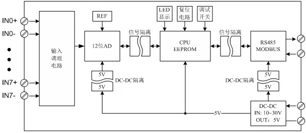 1. Входной канал: 8-канальная изоляция 2. Тип сигнала: 0 ~ 20 мА, 4 ~ 20 мА, 0 ~ 5VAnd0 ~ 10VFour виды аналоговых сигналов 3. Частота дискретизации:200 Гц(В секунду на канал25Раз) 4. Разрешение: 12 битов 5.Точность:Входное напряжение0.2%Входной ток0.3% 6.ADСхема сбора и ЦПЗащита изоляционного напряжения: 1500 В |