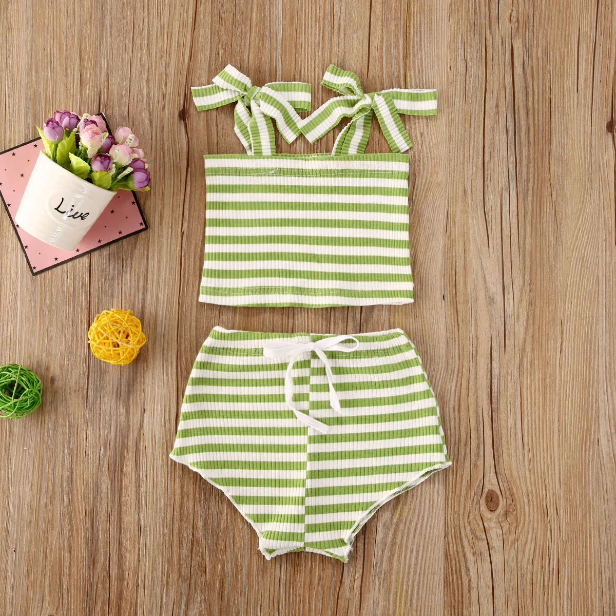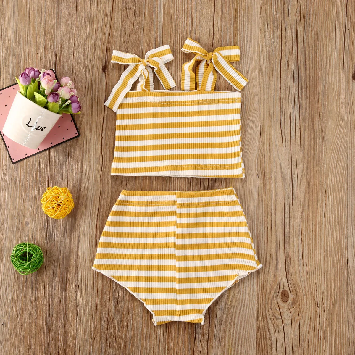 Комплекты вязаной одежды в полоску для маленьких девочек, топ-труба с завязками на плечах + шорты с высокой талией, стильная одежда из 2 предметов