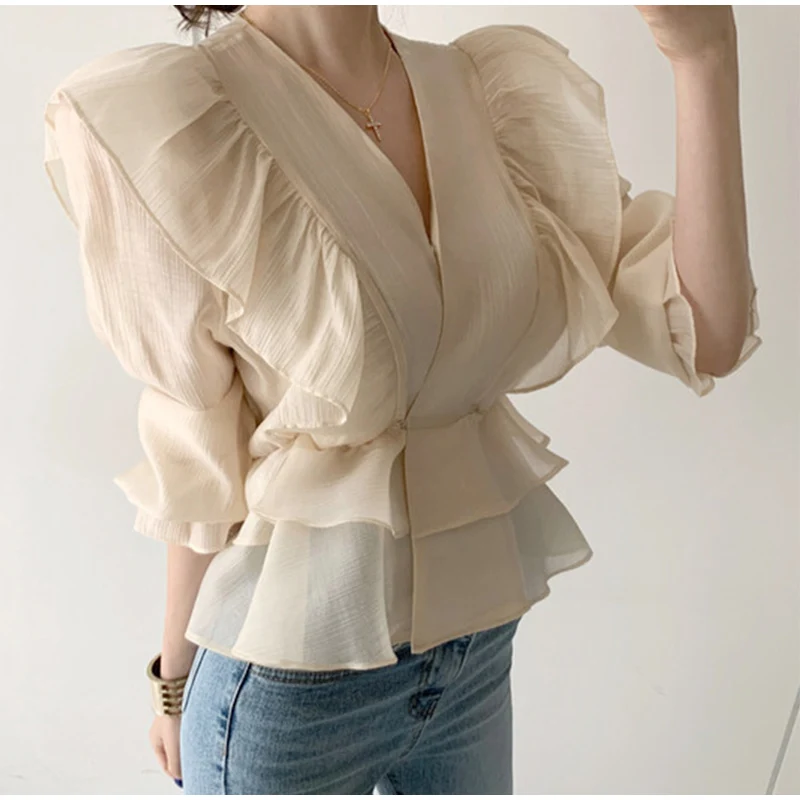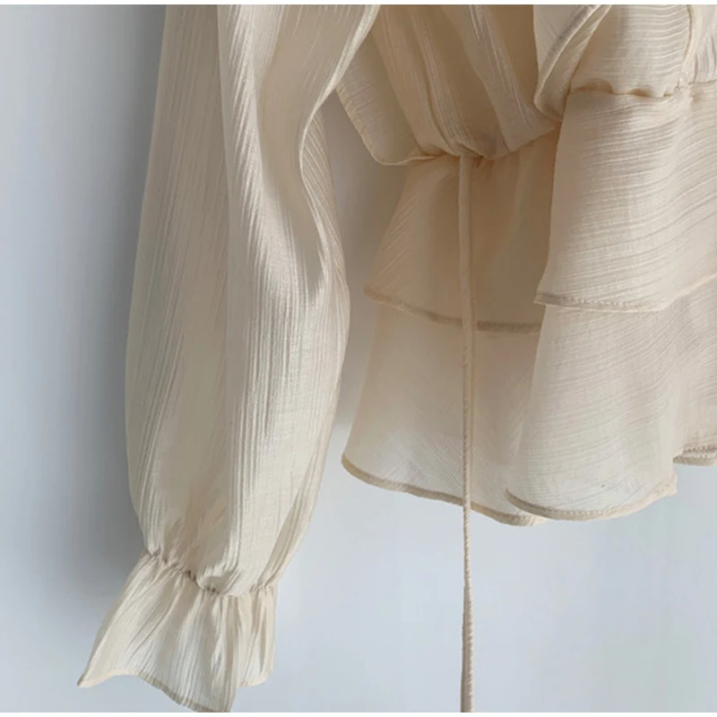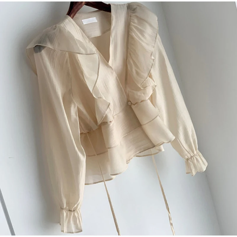 Летние женские блузки на шнуровке с оборками и v-образным вырезом, женская блузка с длинным Расклешенным рукавом, Новинка осени 2021, прозрачные офисные женские топы