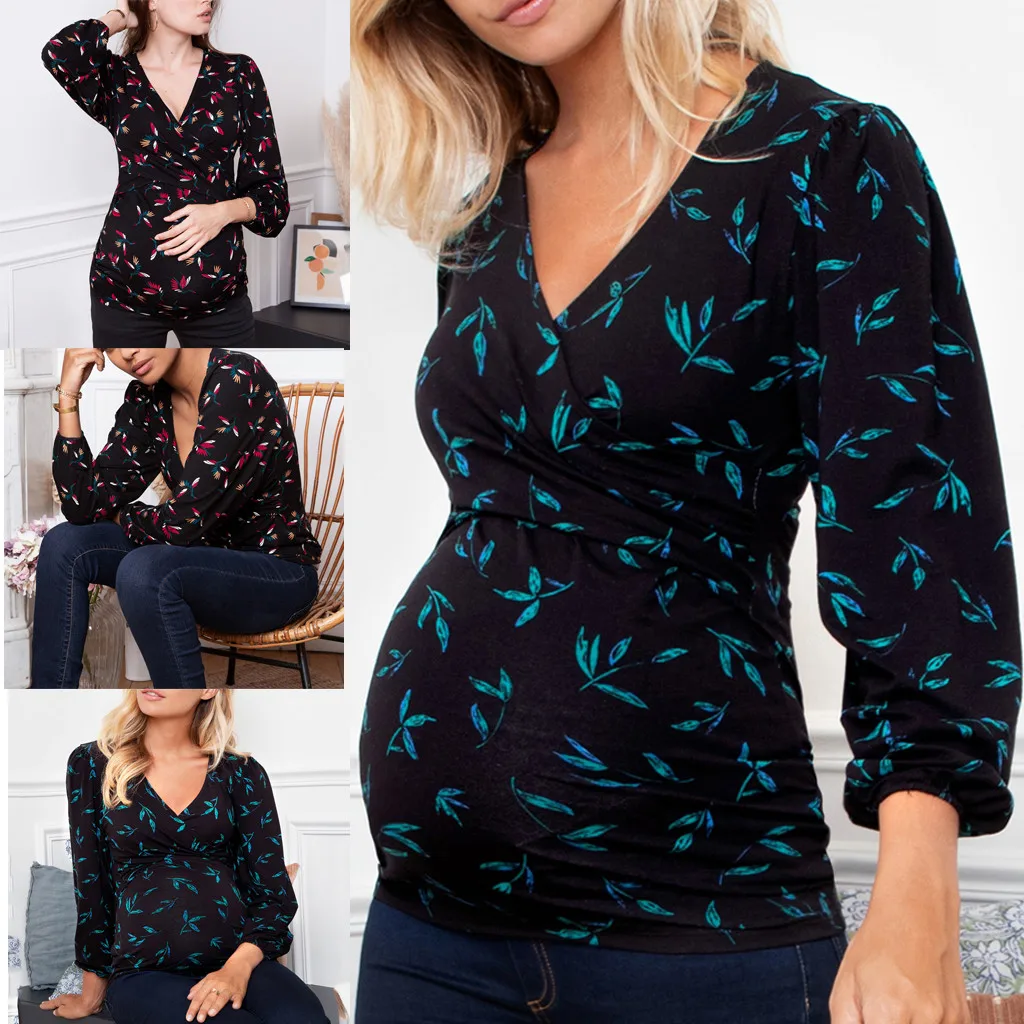 Одежда для беременных женщин блузки для беременных женщин Nusring для беременных V-образный вырез с длинным рукавом оборки печатные блузки Топы