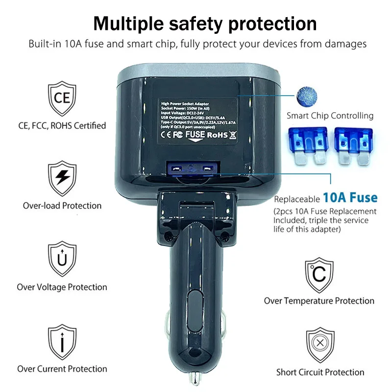 Встроенный сменный предохранитель 15А и защитные цепи предотвращают разветвитель питания автомобиля и ваши устройства от перегрева, перегрузки или короткого замыкания. Помехи, свободная производительность навигации и потоковой передачи данных, улучшенный нескользящий штекер надежно остается в вашем автомобильном разъеме.