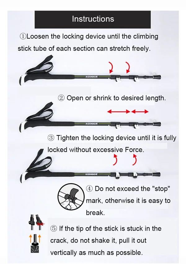 Купите два и получите скидку 10% на оптовую цену. Бренд: kodenor Название продукта: Тройная внешняя ручка для альпинизма Модель: 3 серии Длина расширения: 63-135 см Количество секций диаметр трубы: 3 секции Материал стержня: авиационное углеродное волокно Запястья материал: ЭВА (этиленвинилацетат) Точечный Материал: Вольфрамовая сталь с алмазным узором Система блокировки: расширенный внешний замок Вес нетто: 0,17 кг/0,34 фунта Использование: альпинизм, туризм, игра, кемпинг Примечание: Из-за различных личных методов измерения, если происходит погрешность в 1-3 см в ширину, это относится к нормальному диапазону. Изображение является фактическим продуктом, но из-за различных настроек освещения и дисплея может быть небольшая Хроматическая аберрация.