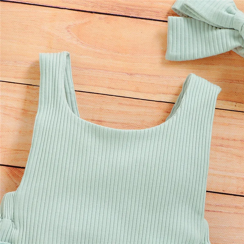 Плиссированный комбинезон без рукавов и без спинки для маленьких мальчиков и девочек, белый и зеленый хлопковый комбинезон с оборками, Вязаный комбинезон в рубчик, повязка на голову, комплект из 2 предметов!