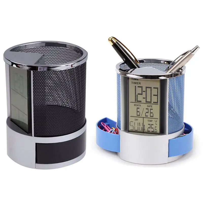 Сетчатый Карандаш держатель с цифровым ЖК дисплеем офисные настольные часы