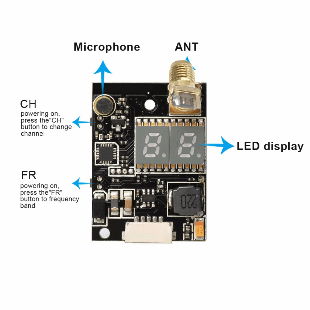 This 5.8GHz 40CH FPV transmitter has double push buttons for easy changing CH and FR.