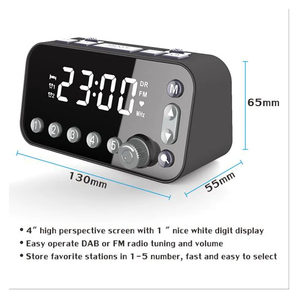 Радиоприемник имеет светодиодный дисплей большого размера, легко смотреть время, особенно для пожилых людей. С помощью этого продукта вы можете наслаждаться радио DAB и fm-радио. Радио можно установить как таймер будильника, и вы можете установить два таймера будильника, чтобы выйти в другое время.