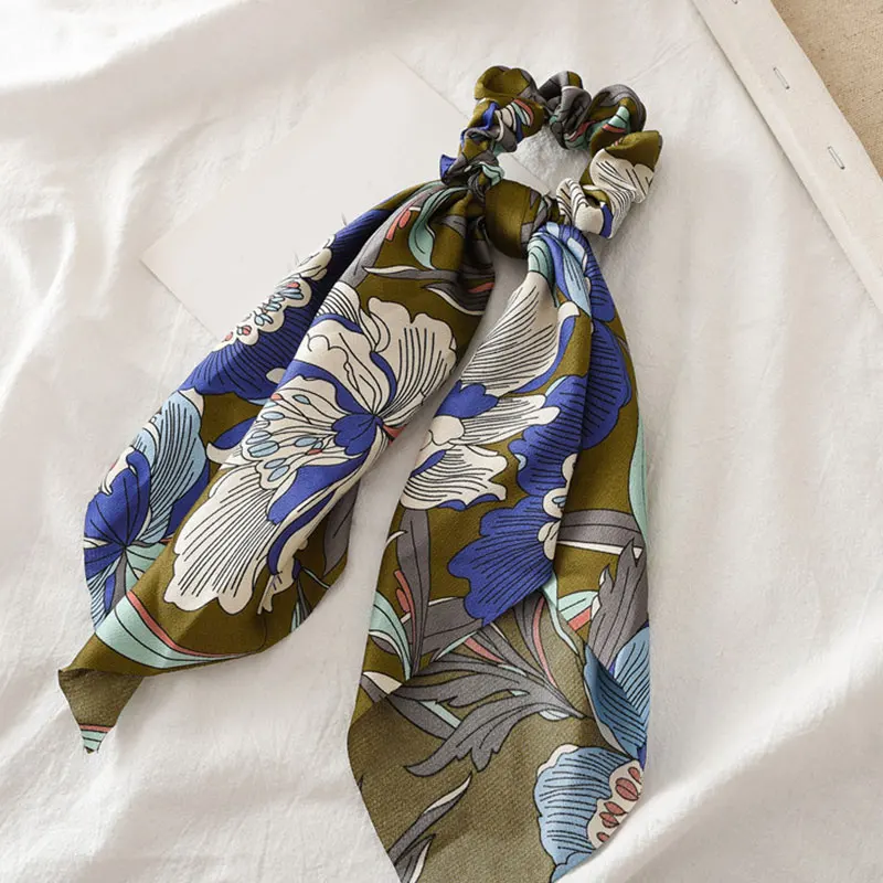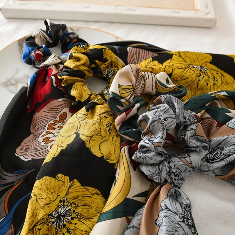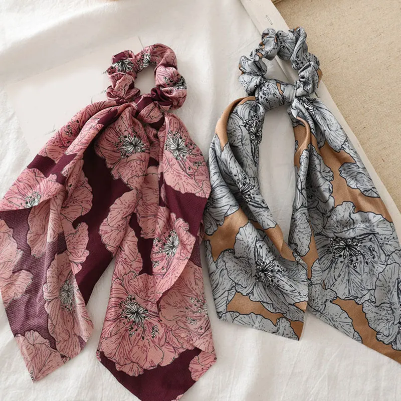 Винтажный атласный шарф для волос с цветочным принтом, эластичные Галстуки для волос с бантом
