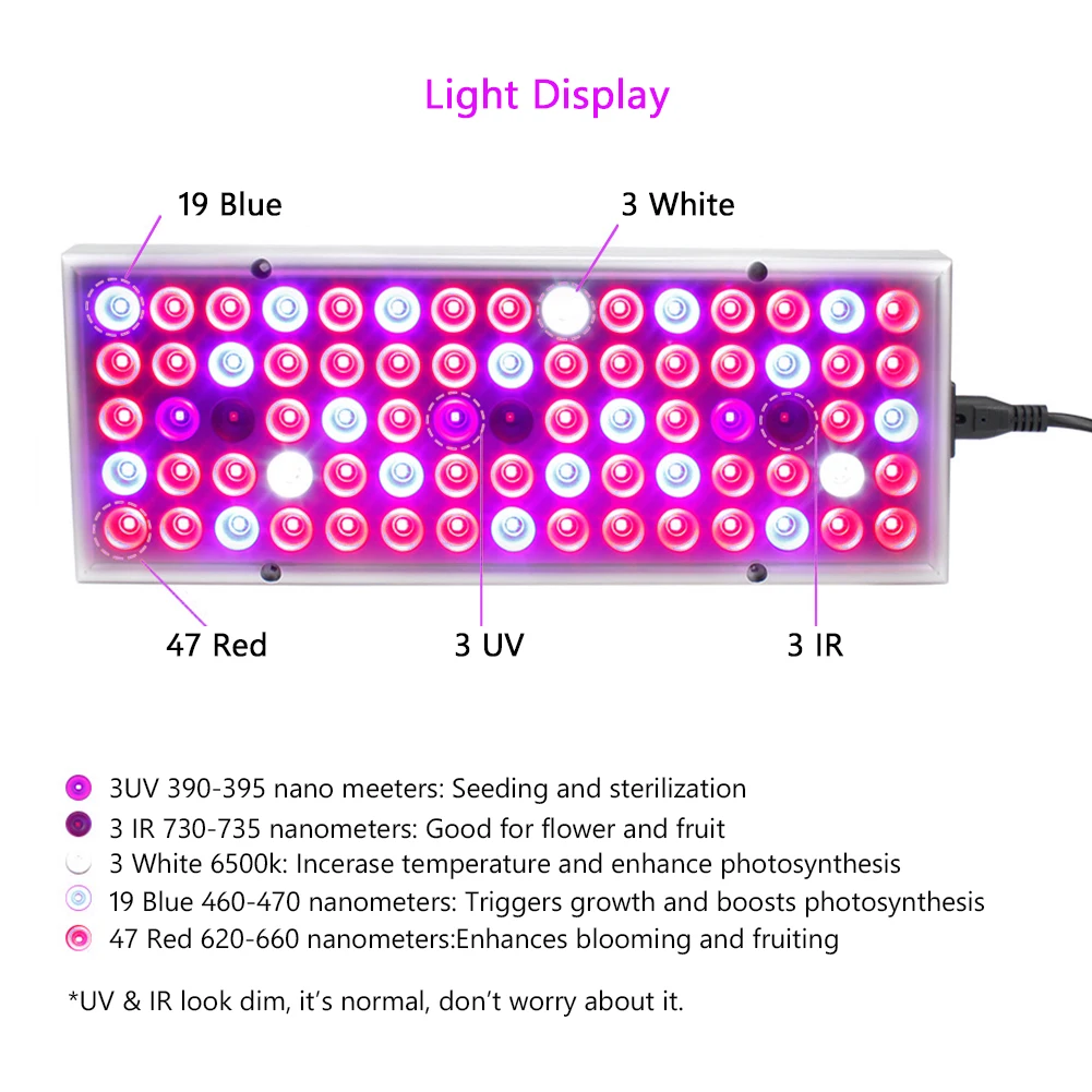 Особенности 100% Новинка! Модернизированный Светодиодный светильник для выращиванияREd + синий + белый + UV + IR, дает идеальную длину волны для всех этапов выращивания, идеально подходит для прорастания, цветения и плодоношения. Изготовлен из высококачественного АБС-пластика, превосходный контроль тепла и рассеивание. Регулируемый охват, высокие светящиеся растущие лампы покрывают Макс. 3x3 фута на 2 фута высоты, что было рекомендовано повесить на около 4-12 дюймов от растения в зависимости от растущего цикла. Энергосберегающий 2835 Светодиодный бисер, потребляет меньше электричества, создает меньше тепла, Ультра стабильный и длительный срок службы. Широко используется в теплице, саду, вертикальной ферме, палатке для выращиванияСадовая комната и аквариум для помощи гидропоники и комнатным растениям почвы, таким как Орхидея, картофель, салат, Чили, помидоры и водоросли, растут здоровым образом. Удобный и яркий светильник для выращивания растений, идеально подходит для теплицы, гидропонной системы и внутреннего садоводства. Технические характеристики Светодиодный чип: SMD 2835 Входное напряжение: AC85 ~ 265 в (По всему миру) Материал корпуса: АБС-пластик с покрытием Тип вилки: США/Великобритания/ЕС/Австралия Утверждение: CE RoHS Диммируемая:Нет Рабочая температура: -20 ~ + 50℃ Рабочая частота: 50/60 Гц Срок службы: 30000 часов Размер панели (прибл.): 25 Вт 31x11.9x2.95 см/12,2x4,69x1,16" 45 Вт 25.2x25.2x2.95 см/9,92x9,92x1,16" Длина кабеля питания (прибл.): 1,53 м/5,02 фута Количество СВЕТОДИОДНЫЙ: 25 Вт, 75 шт., 47 красный + 19 синий + 3 белый + 3 УФ + 3 ИК 45 Вт, 144 шт. 90 красный + 36 синий + 6 белый + 6 УФ + 6 ИК Спектр: Красный 620 ~ 660нм(Улучшает цветение и плодоношение) Синий 460 ~ 470нм(Триггер роста и повышение фотосинтеза для здоровья листьев) Белый 6500K(Дополняют нехватку солнечного света. Дополнение освещения для растений, выращенных в холодную зиму и весну, дождевые дни и тенистые или темные места) УФ 390 ~ 395нм(Рассада и стерилизация, стимулирование синтетического белка, сахара, кислот. Сократить период роста растений) IR 730 ~ 735 нм(Дальний инфракрасный тепловой эффект, поставка роста урожая и развитие тепла спелых фруктов) Внимание 1. Возможны небольшие отклонения в размере из-за измерения человеком. 2. Только для использования в помещении: светильник не является водонепроницаемым, не помещается в воду и не используется во влажных местах. 3. Чрезвычайно яркий: не смотрите непосредственно на светодиодный светильник, когда он работает. 4. Установка: чтобы избежать опасности электрического удара, отключите питание перед установкой. 5. Площадь покрытия: Макс. 3x3 фута на высоте 2 фута (это частично зависит от того, как далеко вы поднимаете светодиодный светильник о своих растениях). 6. Предполагаемое расстояние: 1-2 фута (для сеялки, идеальное расстояние-8-10 дюймов). 7. Предполагаемое время работы: 10-12 часов в день. Посылка в комплекте 1 х светодиодный светильник для выращивания 1 х Кабель питания 1 х стальные подвесные наборы (с 4 веревками) 1 x Руководство пользователя
