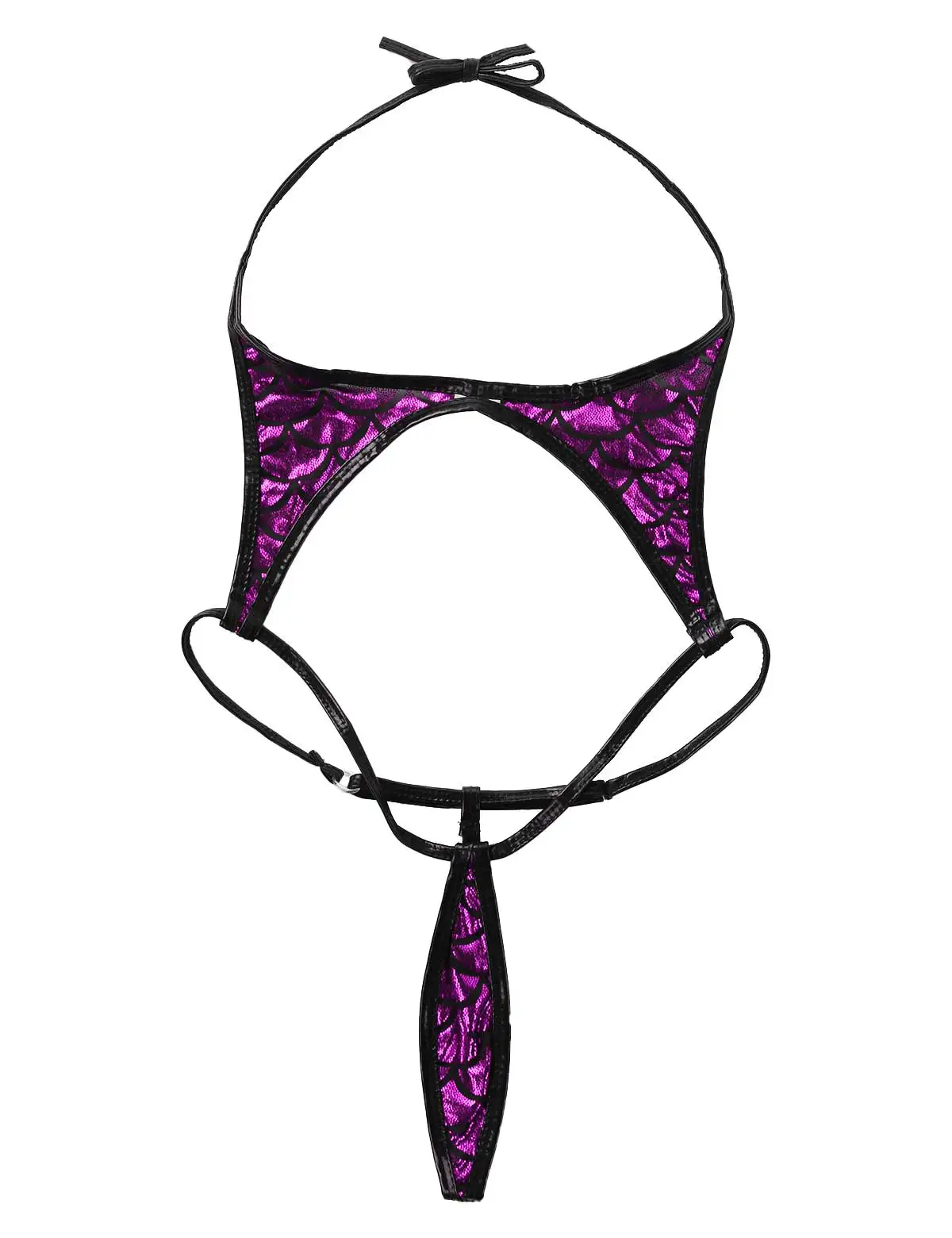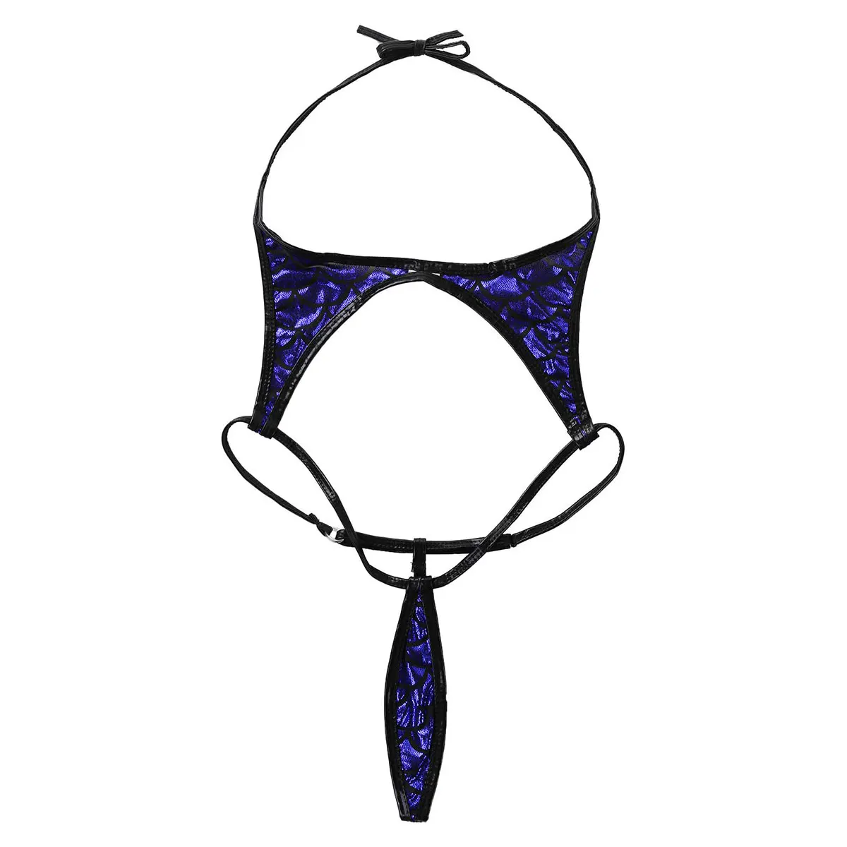 Womens One-piece Shiny Metallic Mermaid Fish Scale Printed Lingerie Halter Neck Backless Exotic Micro Mini Teddy Thong Bodysuit Bikini Monokini Swimsuit